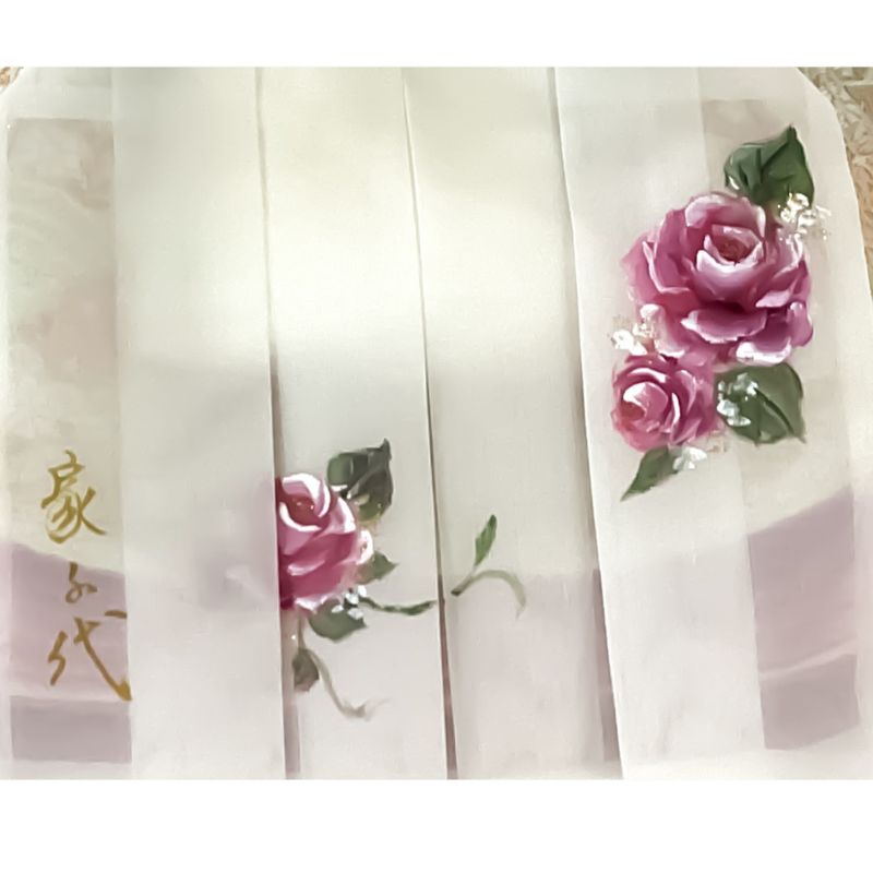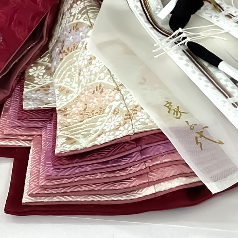 女性作家 柴田家千代作の雛人形人形のお衣裳はバラの柄が入った生地を着せ付けました。落ち着いた雰囲気の中にも高級感漂う親王飾りとなりました。京を感じる華やかな柄の屏風が印象的です。道具には唐草文様を施しました。唐草は生命力が強く、また、途切れることなく伸びていくその様子から“子孫繁栄”“長寿”の意味があります。
