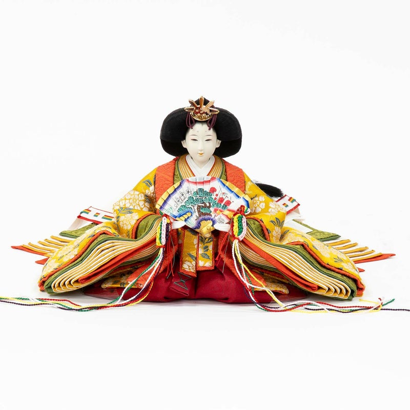■女雛は鮮やかな黄色に桜柄の正絹衣裳を着せ付けました。