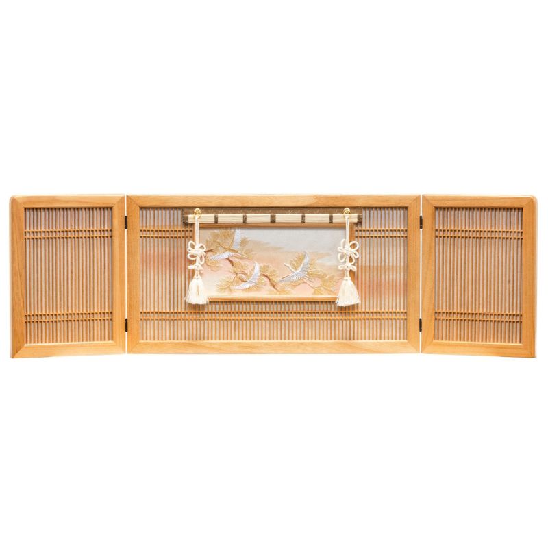 格子窓を配し、大空に舞い上がる鶴の刺繍を屏風に施しました。