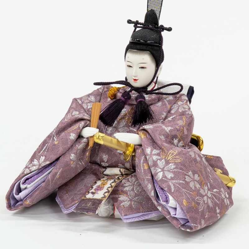 ■男雛には淡い紫色に桜柄を織り出した衣裳を着せ付け。