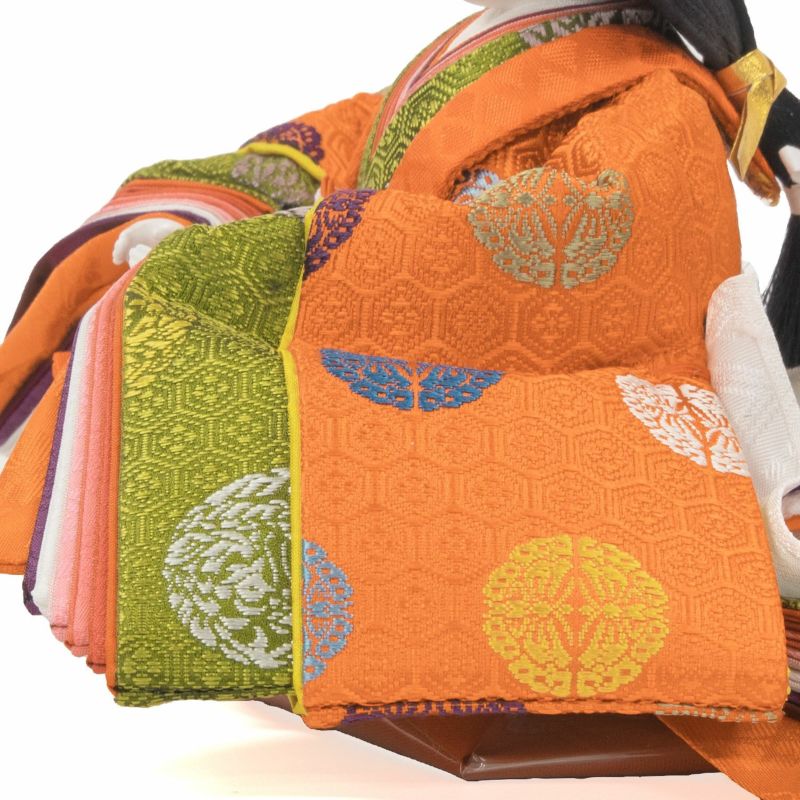 ■男雛には、天皇陛下のみが着用される“黄櫨染桐竹鳳凰文御袍(こうろぜんきりたけほうおうもんのごほう)”を写した正絹衣裳を着せ付け。