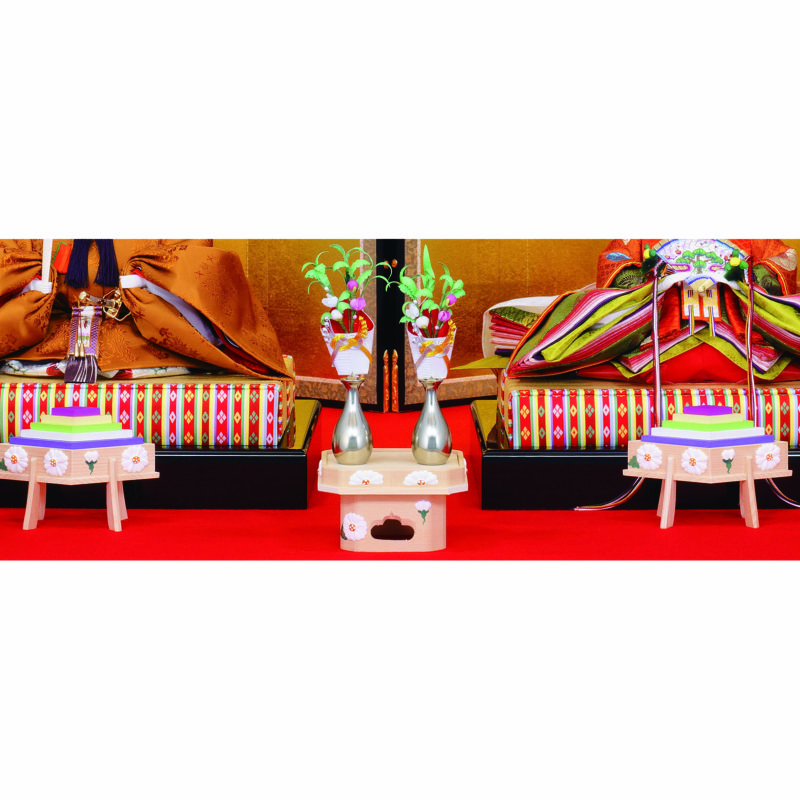 ■雛道具は、檜に菊文様を用いた菱台に三方をセット。