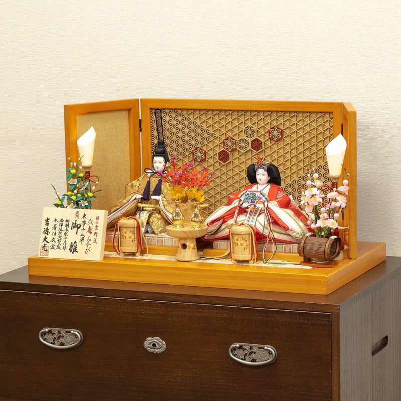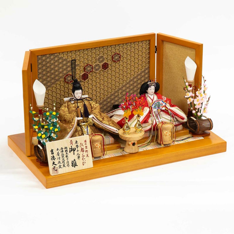 麻の葉加工を施した屏風と正絹衣裳のお人形を組み合わせた親王飾りです。
