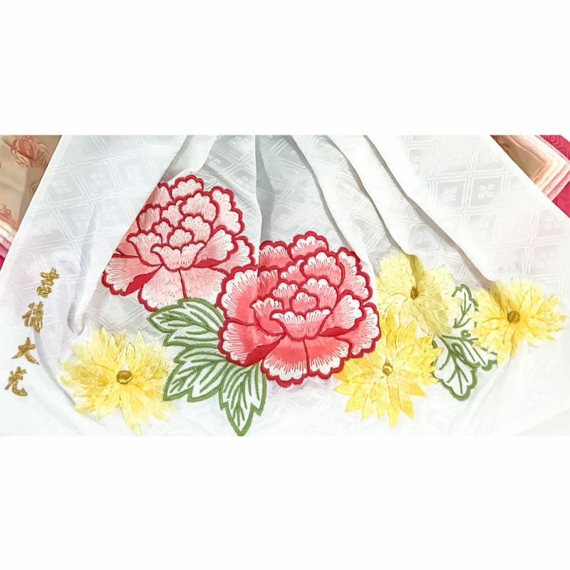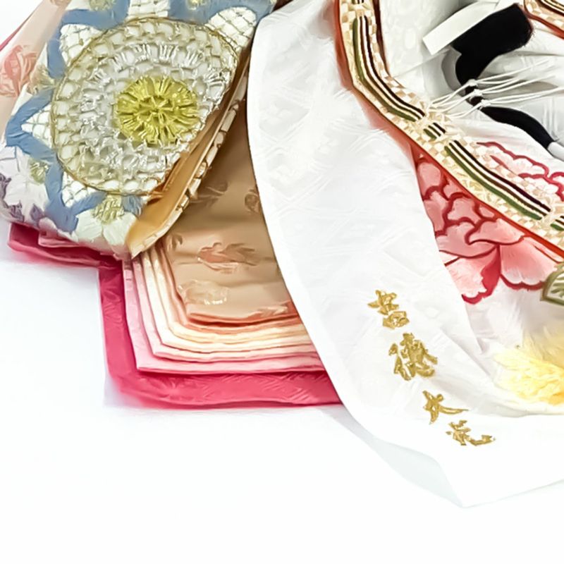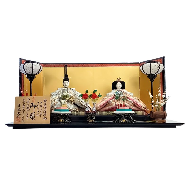 初節句、ひな祭りのお祝いに雛人形はいかがでしょうか。雛人形は、女の子の誕生を祝うとともに、その健やかな成長を祈って飾ります。汕頭正絹帯地で仕上げたお人形にこだわった親王飾りです。汕頭帯地は様々な刺繍の技術を駆使した工芸的な価値の高い逸品です。汕頭刺繍は“絹の彫刻”と賞賛され、豪華なドレスに欠かせない技術です。女雛の裳には刺繍で“吉_大光”の文字を入れました。屏風は金箔押しで出来ており、枠は秋田杉で仕上げました。杉は親水性があり軽く、そのうえ強度があるのが特徴です。道具には唐草文様を施しました。唐草は生命力が強く、また、途切れることなく伸びていくその様子から“子孫繁栄”“長寿”の意味があります。