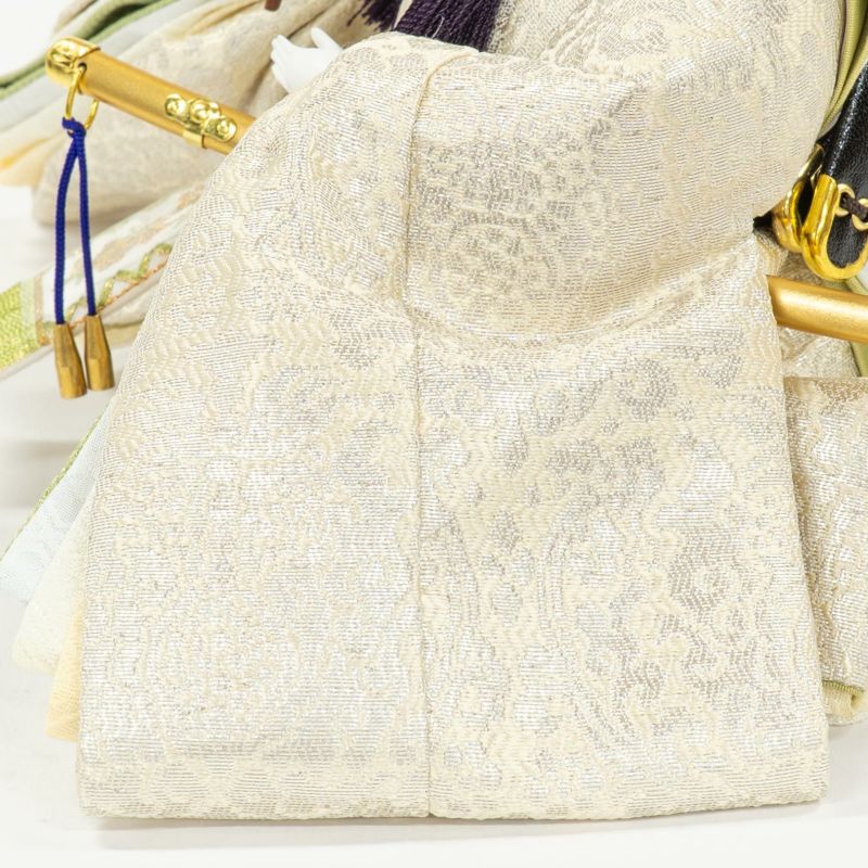 ■淡い、そして上品な色合いに宝冠文様を織り出した正絹衣裳をお人形に着せ付けました。