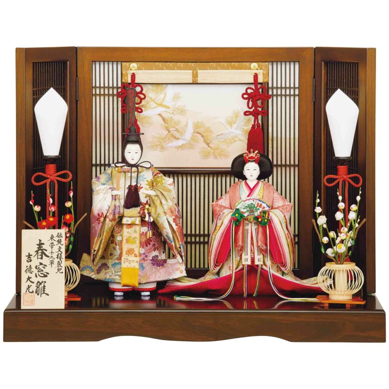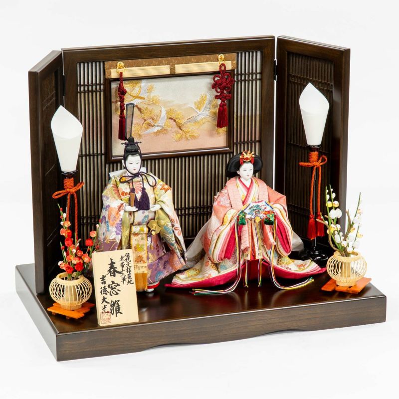 伝統の技に現代感覚を巧みに融合させた吉徳を代表とするベストセラー。背景の格子屏風と鶴の刺繍が印象的な雛飾り。