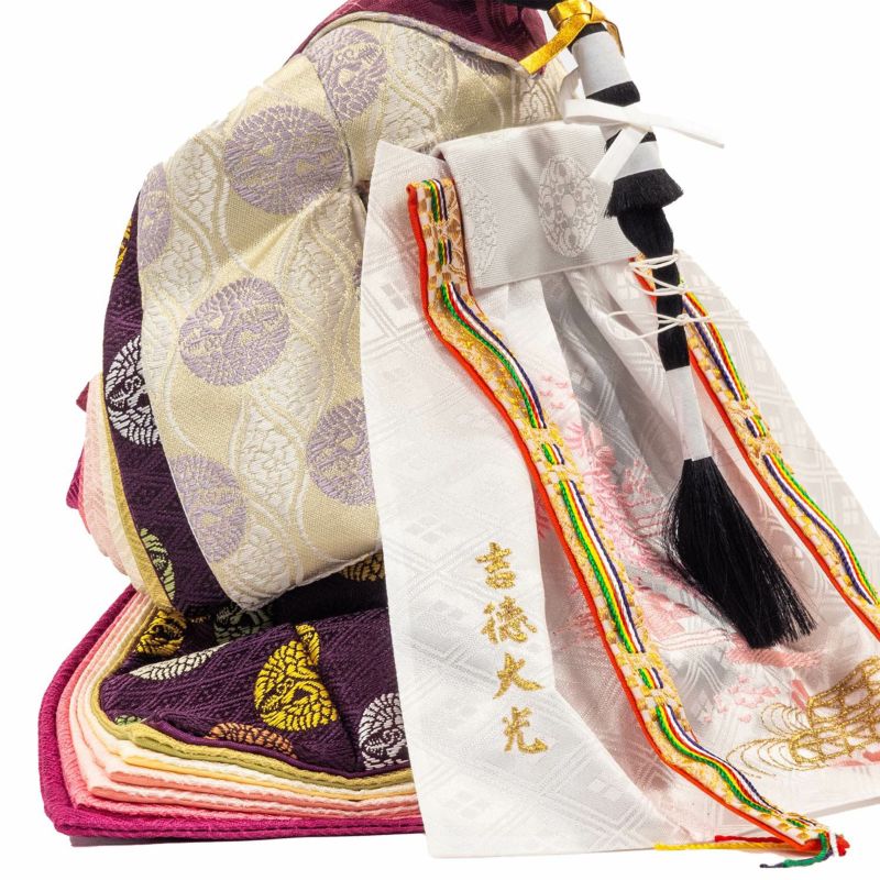 格式のある紫色の男雛に、女雛の白い唐衣が印象深い立姿親王飾りです。