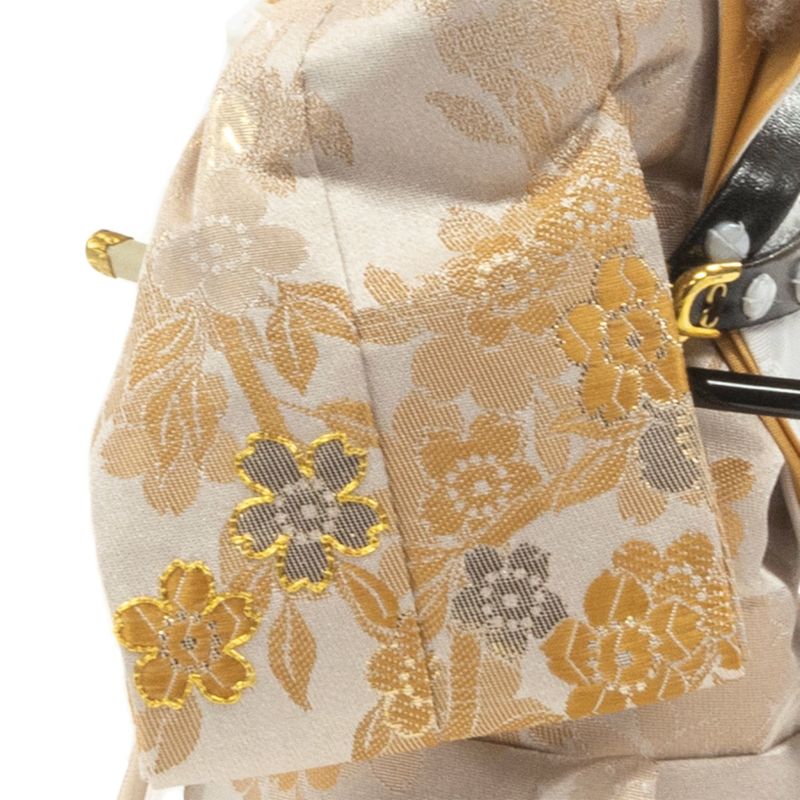 お衣裳や屏風に咲き誇る花々を施した春らしい立ち姿親王飾りです。お人形には四季折々の花々を施した金襴を着せ付けました。立ち姿で着せ付けたことで、金襴の柄がはっきりと出る豪華親王飾りとなりました。真ん中に飾られているスタンドは和紙で出来ており、LEDのコードレスタイプになっています。スイッチを押して頂くと間接照明のような柔らかい灯りが点灯します。