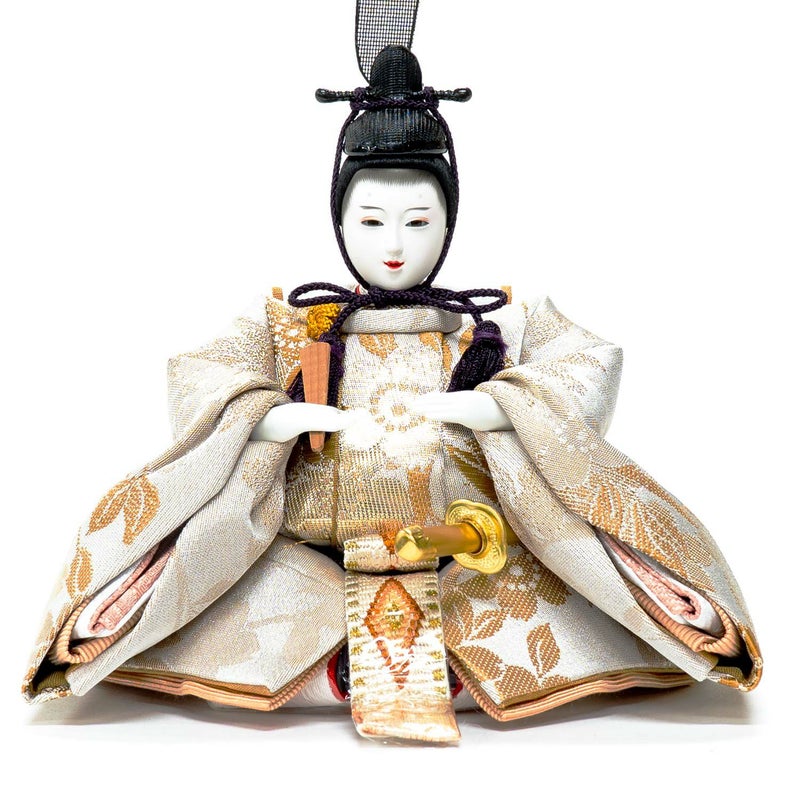 ■男雛には上品ない色合いの生地に金糸で桜を織り出した衣裳を着せ付け。