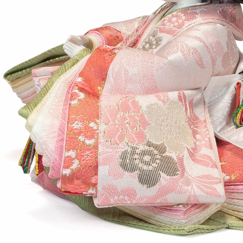 ■女雛にも淡いピンク地に桜柄を織り出した裳を着せ付けました。