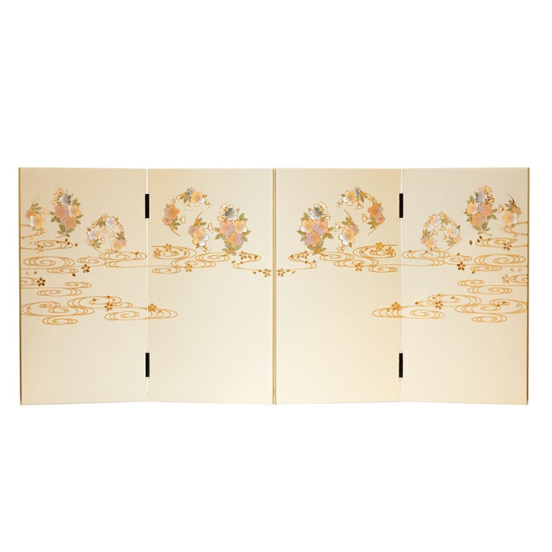 ■グレージュカラーの屏風には流水に桜を蒔絵で描きました。