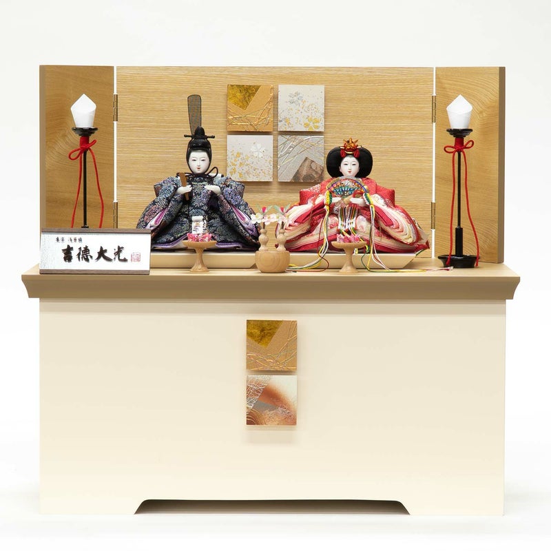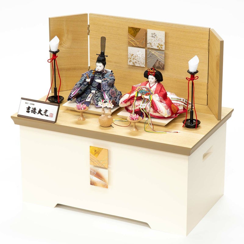 木目の屏風と白色の飾り台となる収納箱が印象的な親王収納箱飾りです。