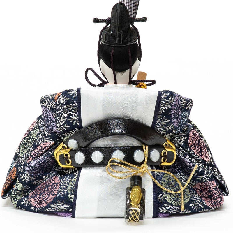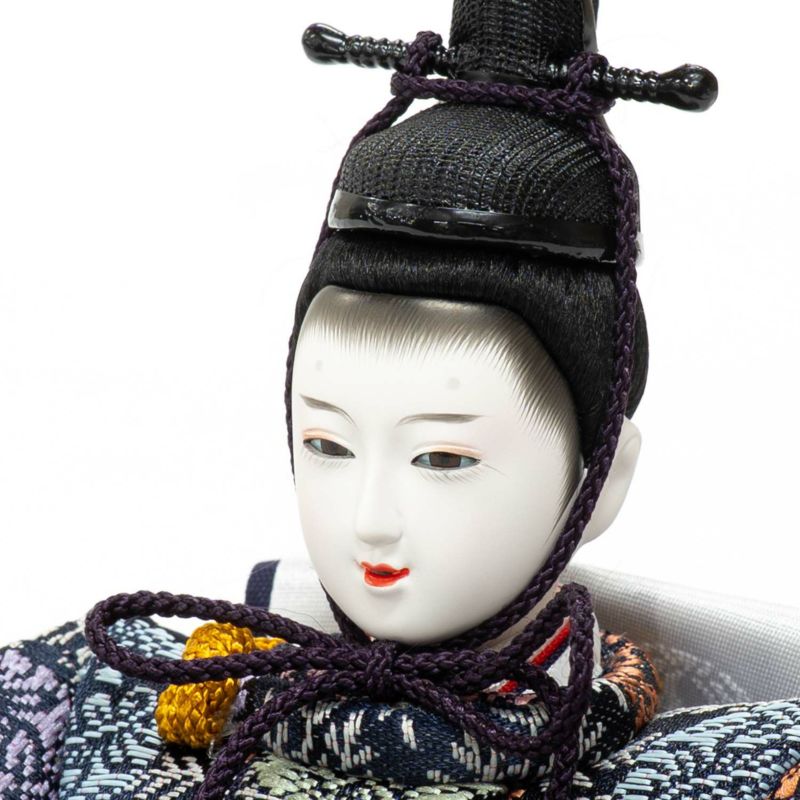 ■シックな色合いに、藤の丸文を織り出した衣裳を着せ付けた男雛。