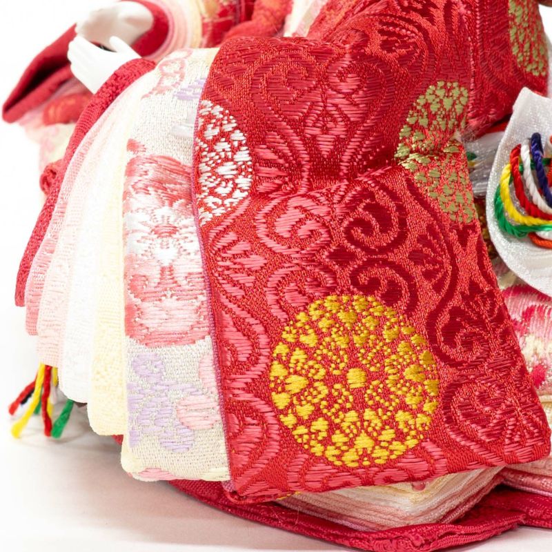 ■色鮮やかな、臥蝶(ふせちょう)の丸文様を織り出した衣裳を着せ付けた女雛。