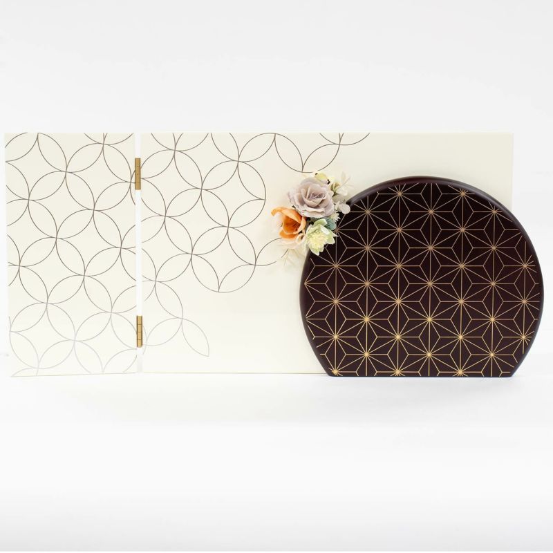 四角と円形を組み合わせたデザイン屏風が印象的な収納箱飾り。