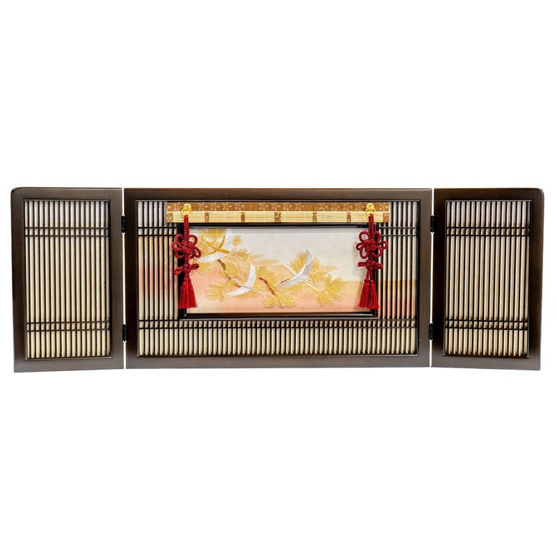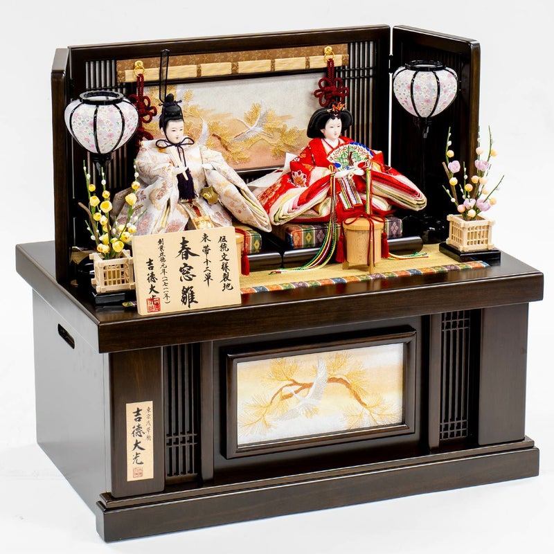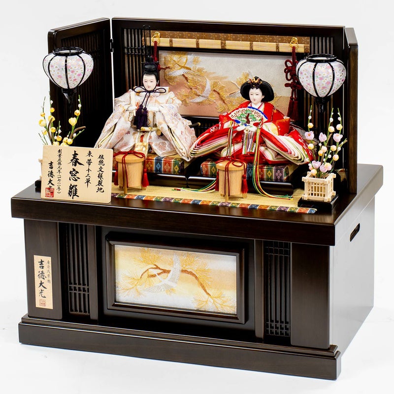 伝統の技に現代感覚を巧みに融合させた吉徳を代表とするベストセラー。背景の格子屏風と鶴の刺繍が印象的な雛飾り。