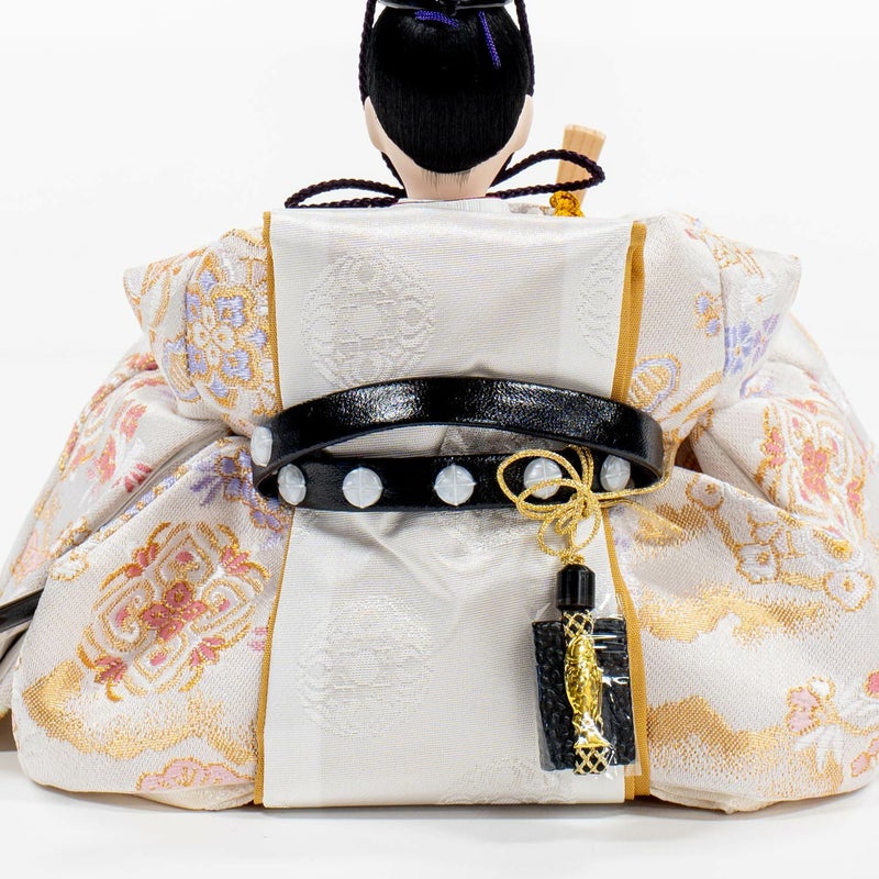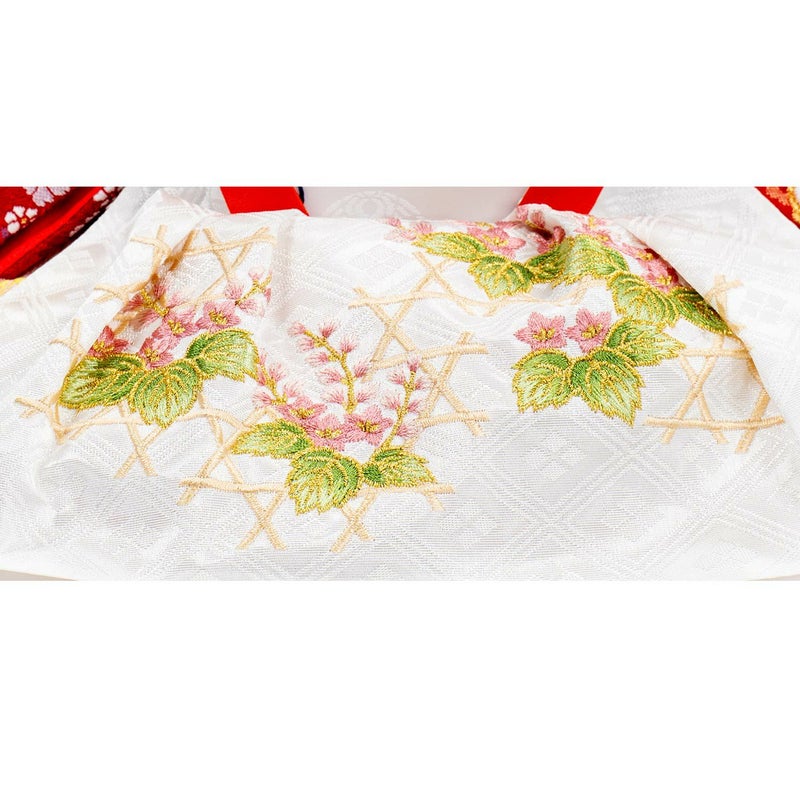 ■お人形には、伝統的な唐花文様が織り出された艶やかな衣裳を着せ付け。