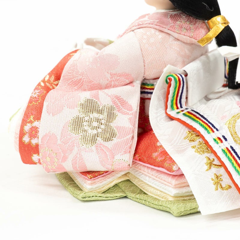 ■お人形には桜の文様を織り出した春らしい色合いの衣裳を着せ付け