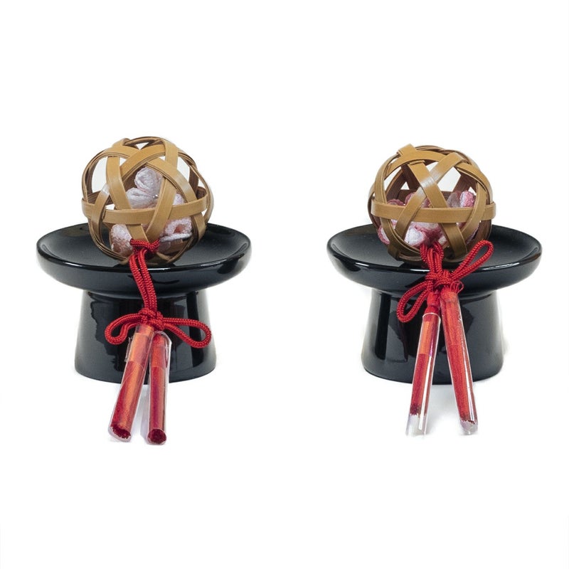 ■お道具には魔除けとなる籠目の竹まりの中につまみ細工の花を入れ、お子様の健やかな成長への願いを込めました。