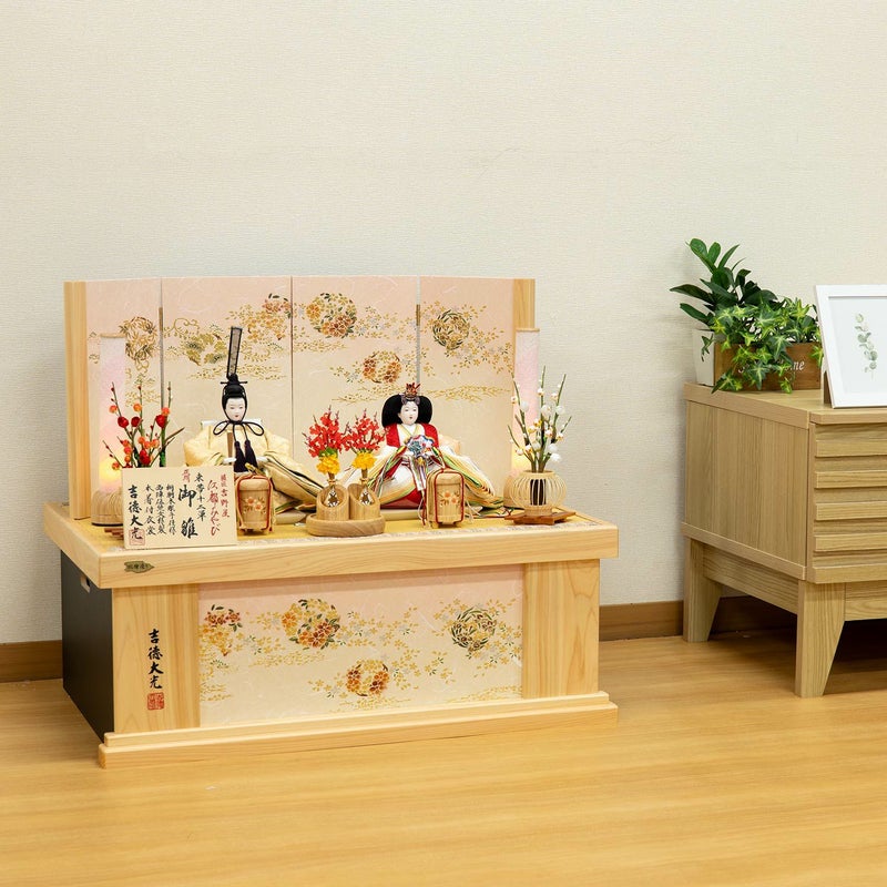 柔らかな色合いの屏風に、優しい色合いのお人形を組み合わせました。