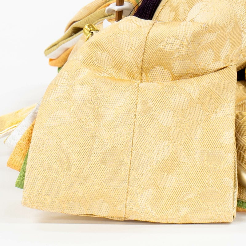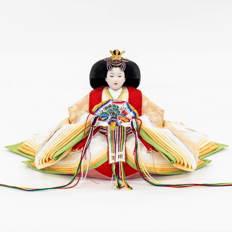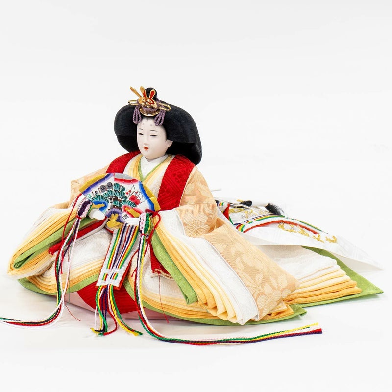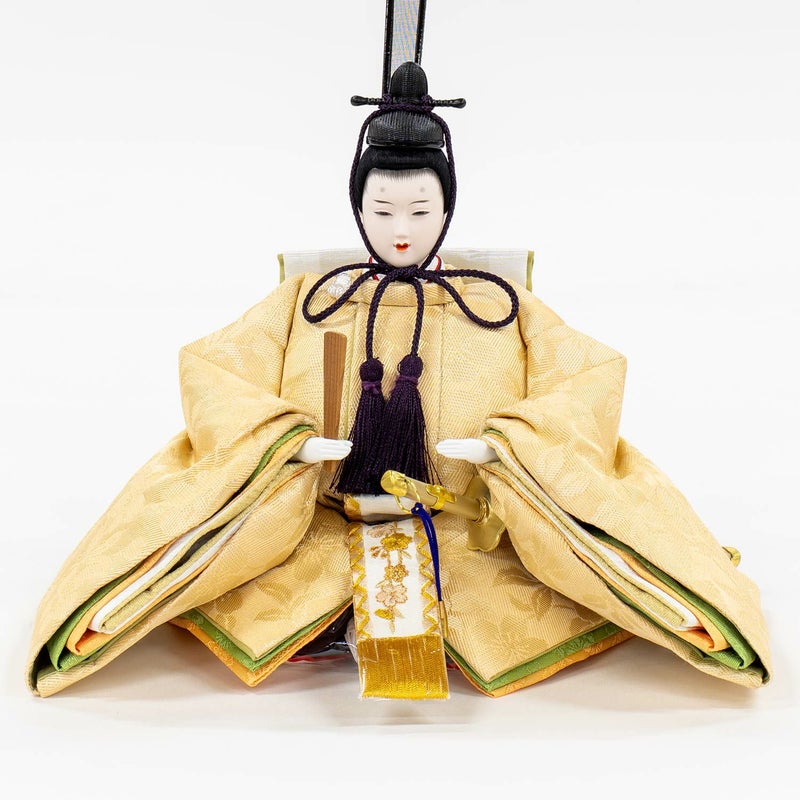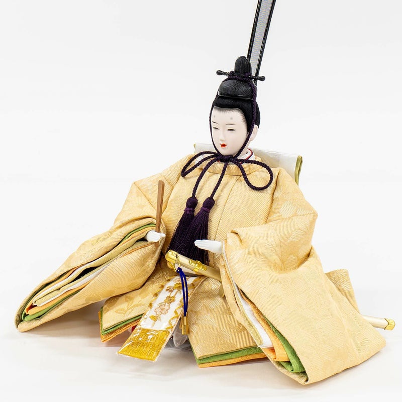 「江都みやびシリーズ」の男雛・女雛の衣裳は、正絹生地を用い、十二単を模した6枚剥ぎ。本物の衣裳のように丁寧に仕立ててから着せ付ける大変手間の掛かる本着せ付。