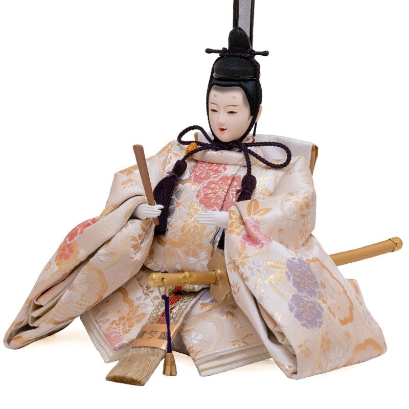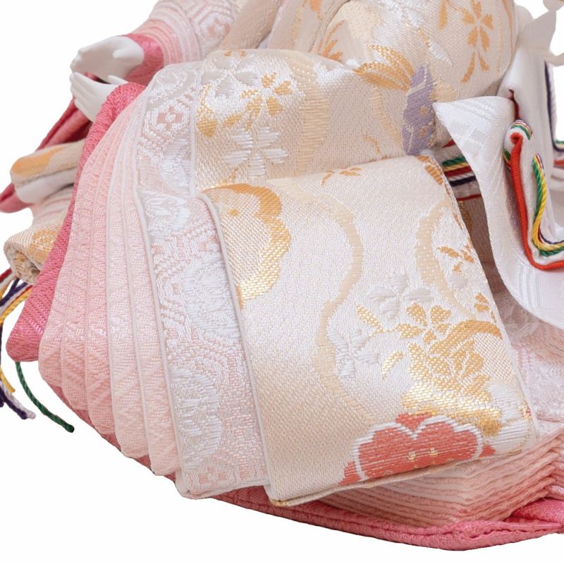 ■お人形には、淡い色合いに伝統文様の「雪輪と桜」を織り出した金襴衣裳を着せ付け。