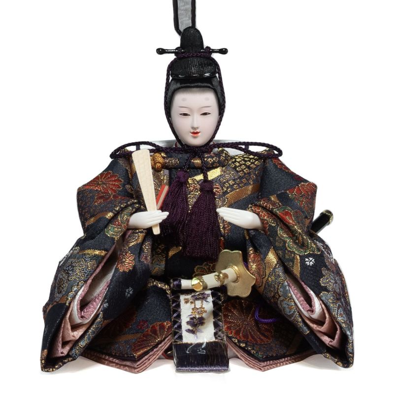 ■男雛、女雛の衣裳は格調高い色合いの菊花流し文様金襴を着せ付け。
