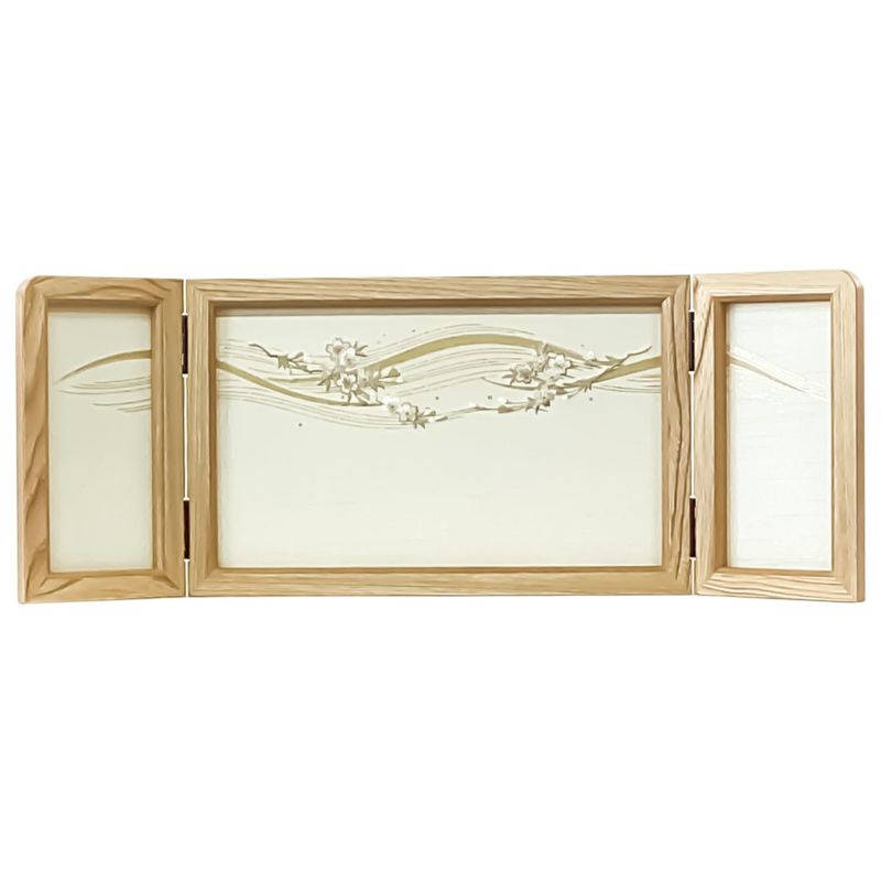 桜並木の風を彷彿させる柄を収納箱と屏風に施しました。行燈も全体の雰囲気に調和しており、コードレスタイプになっていていますので、スイッチを押して頂くと点灯します。