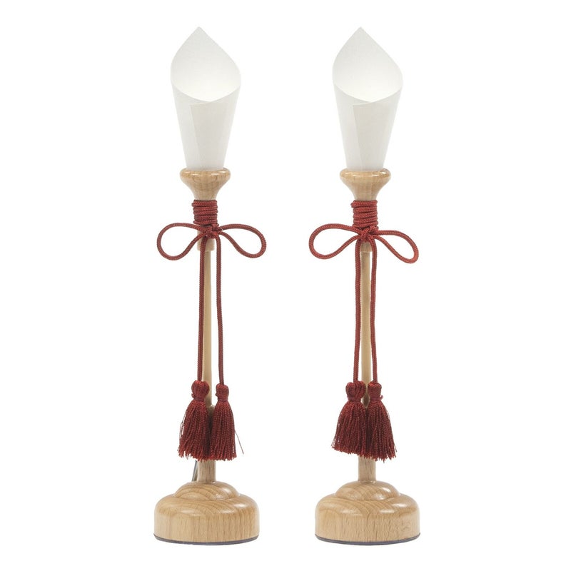 ■木目の燭台はコードレスの電池式で、明かりがともります。