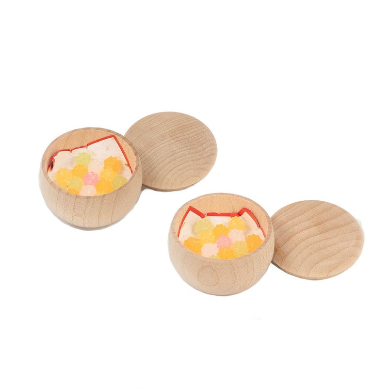 ■木目の器にはお菓子を添えた可愛らしいお道具をセット