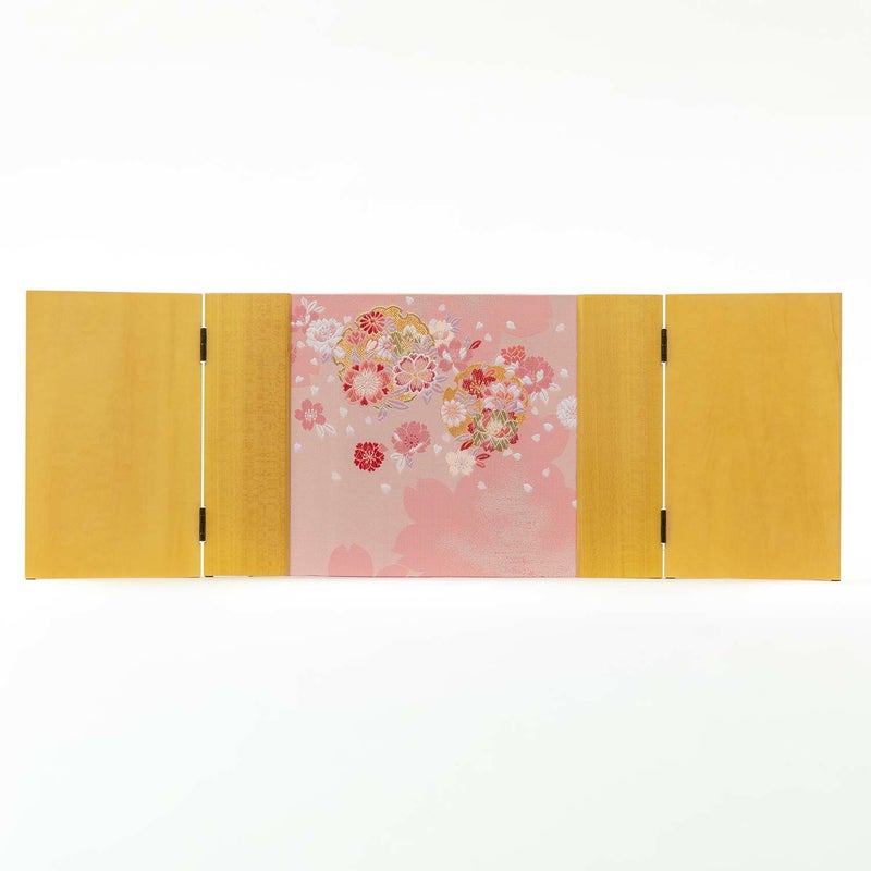 ■木目の屏風には伝統文様の雪輪に桜、花々をデザイン。