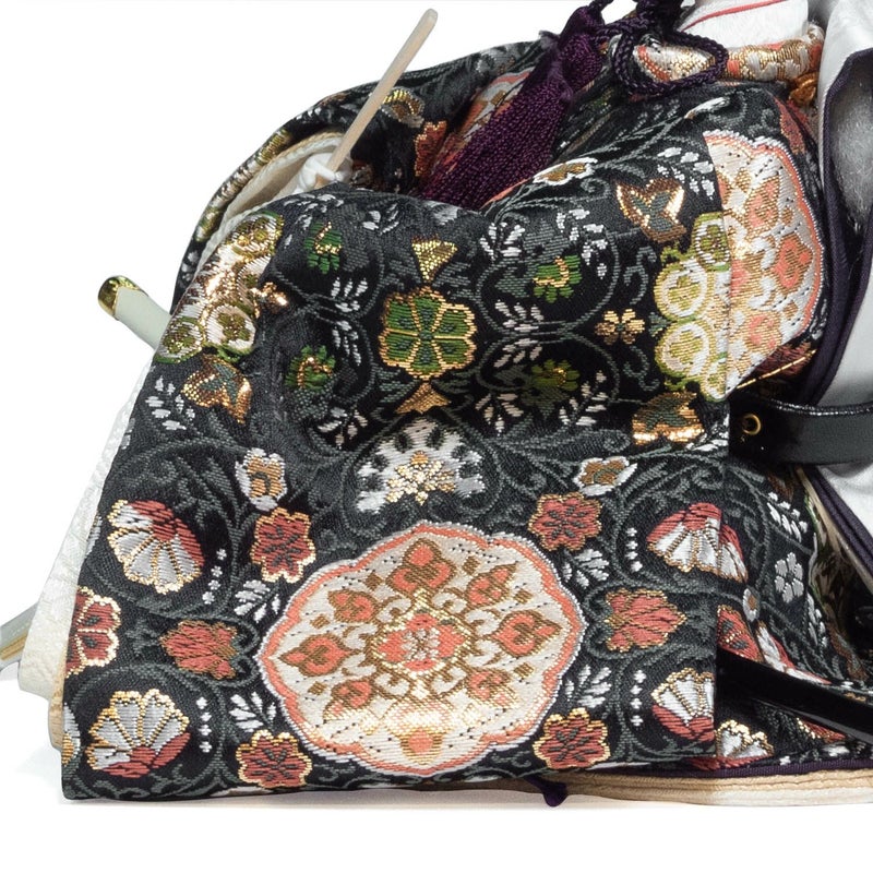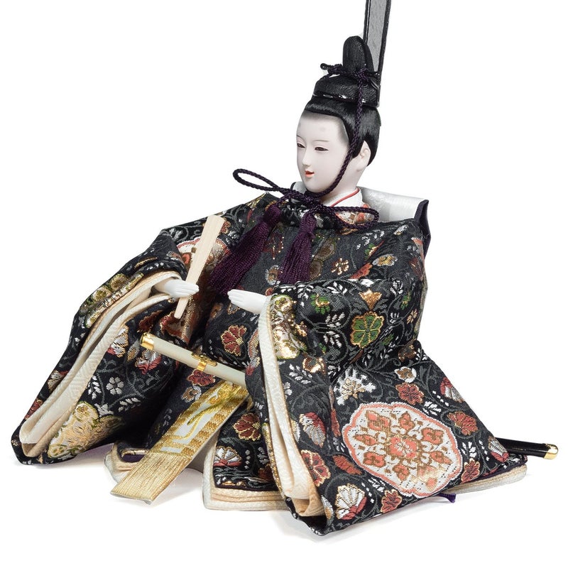 ■男雛には、風格漂う色合いに華文様を織り出した衣裳を着せ付け。