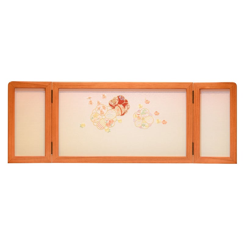 ■屏風には、桜や梅、松、菊など縁起の良い文様を華やかな色合いで刺繍。
