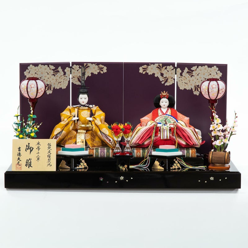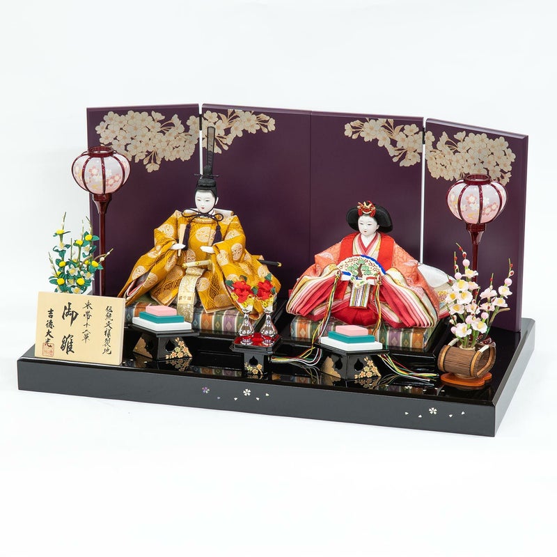 落ち着いた雰囲気の屏風に、気品あふれるおひな様を組み合わせた親王飾りです。