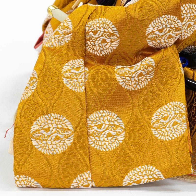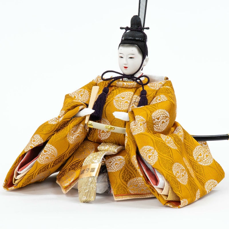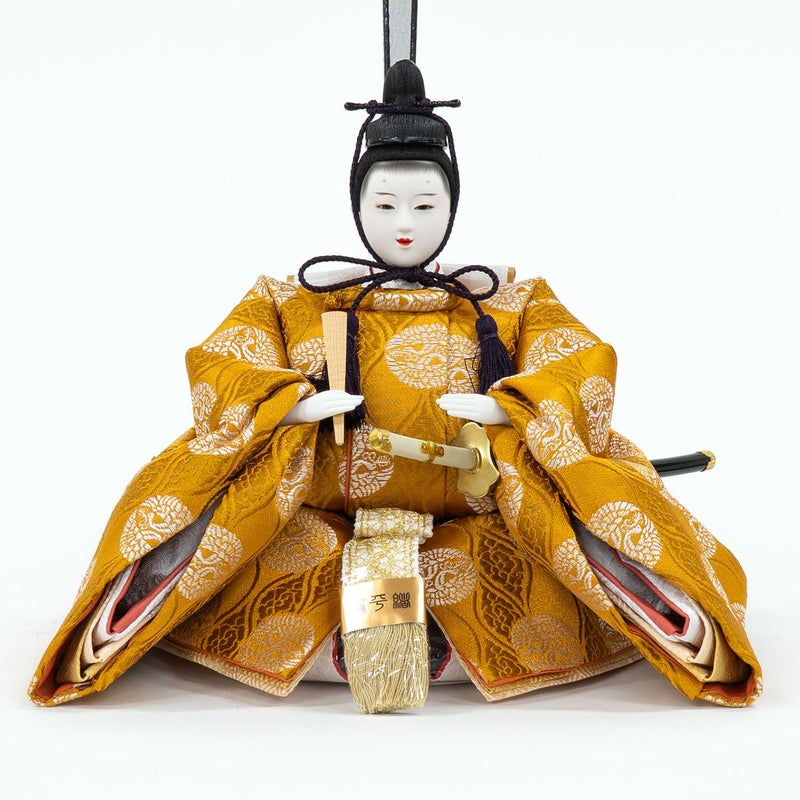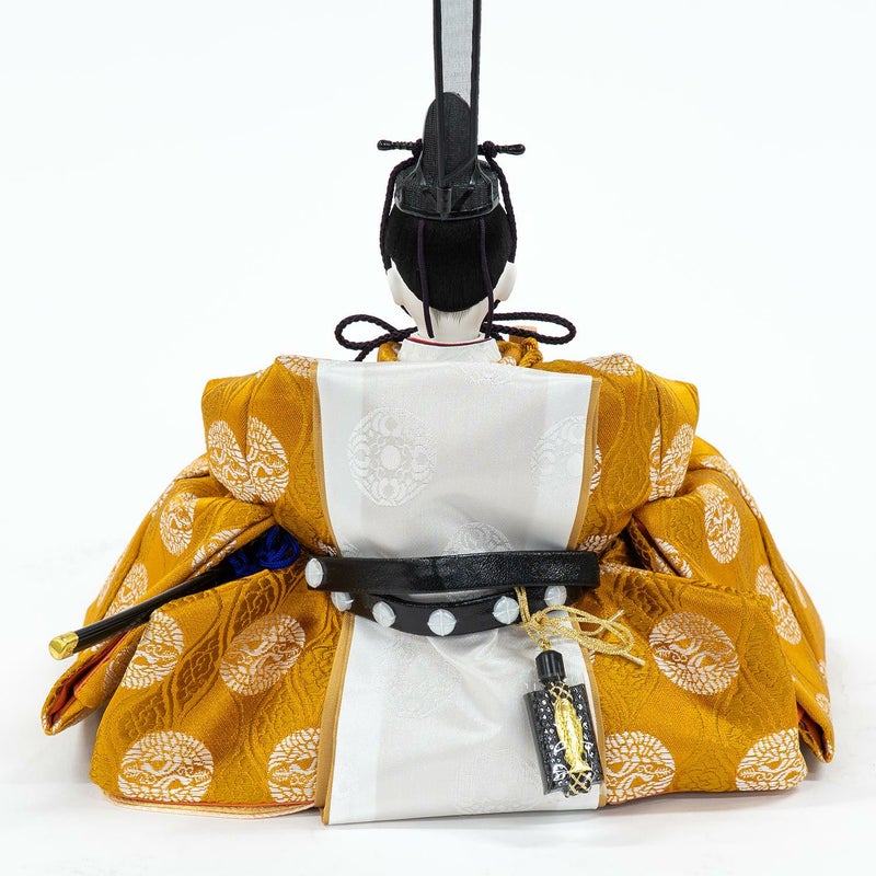■向い鶴文様を織り出した上品な色合い衣裳を着せ付けた男雛。