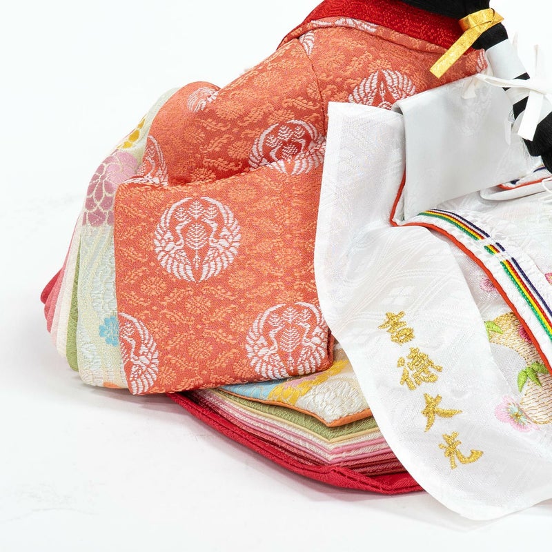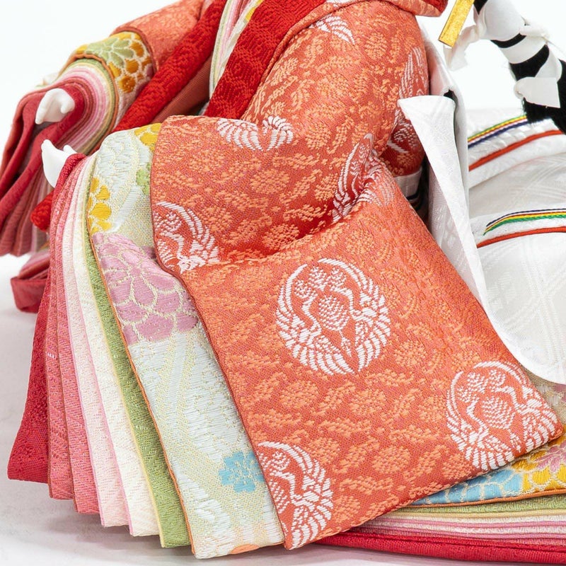 ■色鮮やかな色合い衣裳を着せ付けた女雛。こちらも男雛同様向い鶴文様を織り出しました。