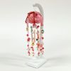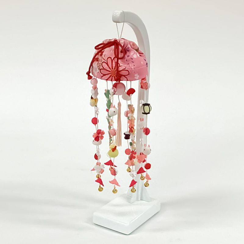 吊るしの小物が映えるよう白い台で仕立てた吊るし飾りです。上部のピンクの笠が全体の可愛らしさを演出しています。