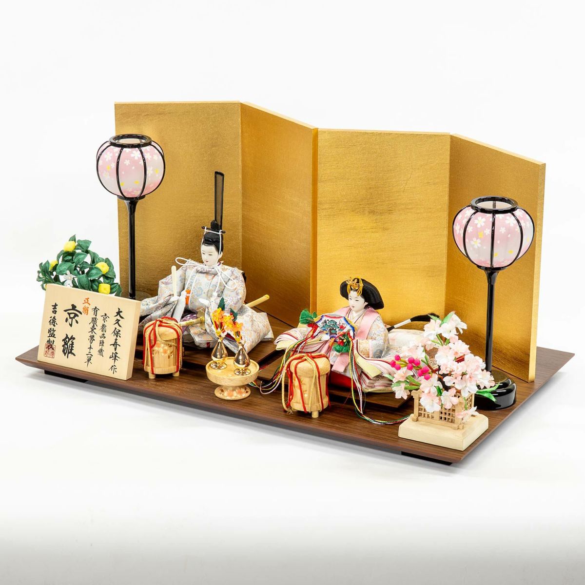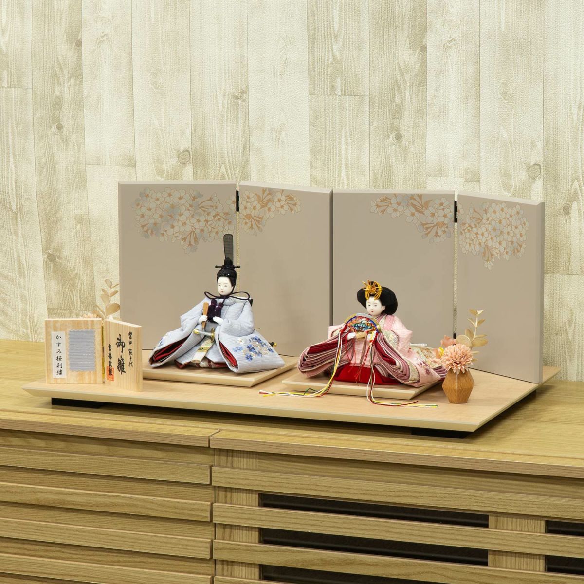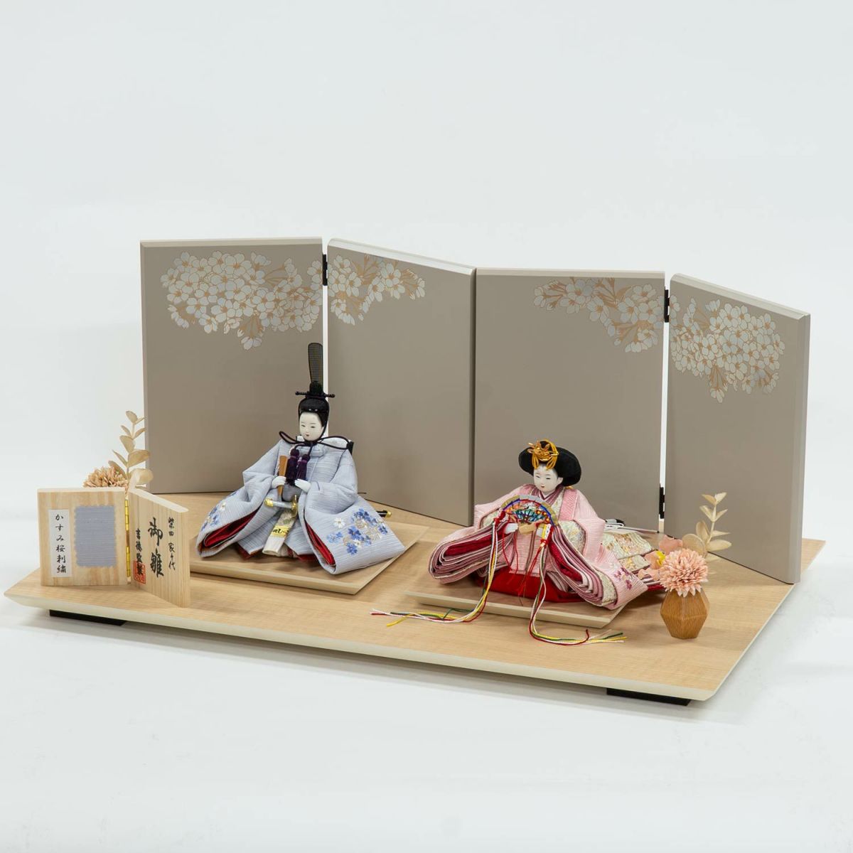 男雛と女雛の一対を飾る、屏風やお道具にもこだわりを持った一式の雛人形です。