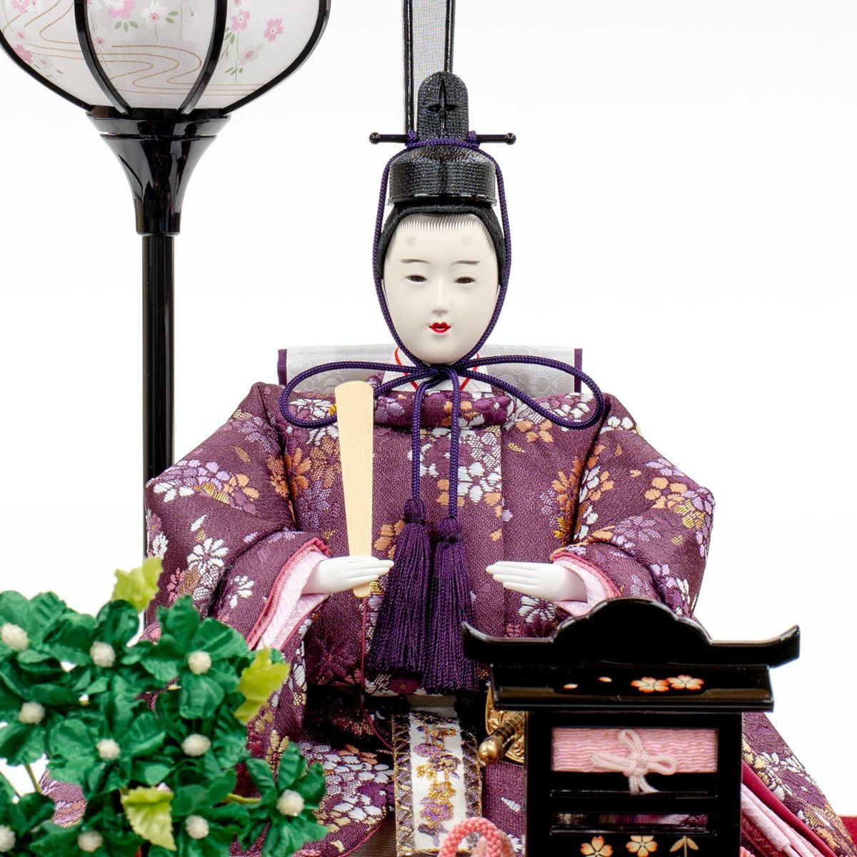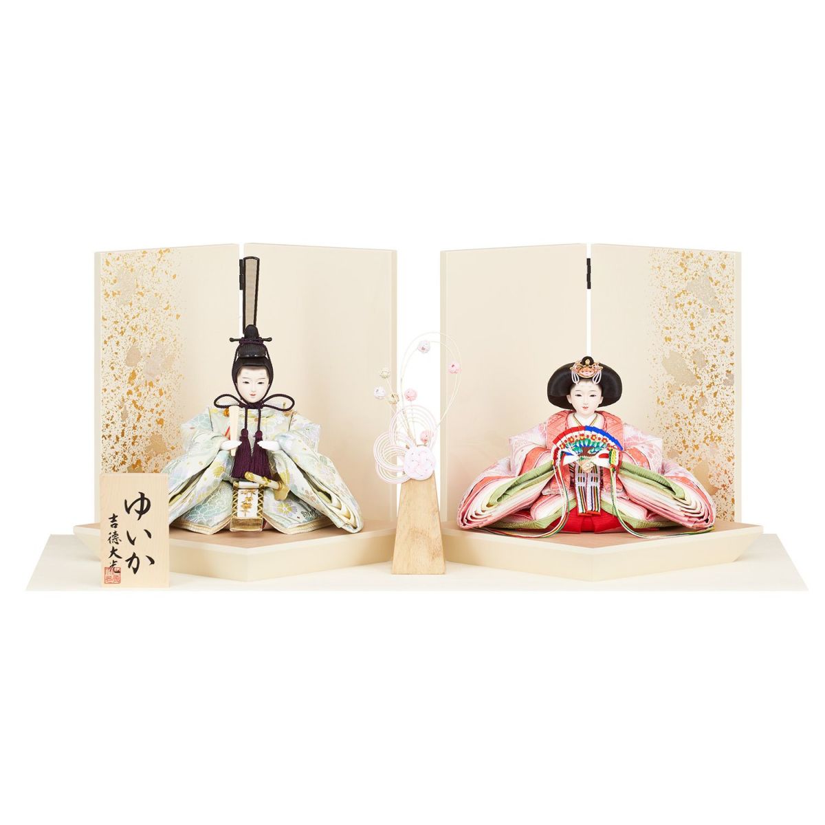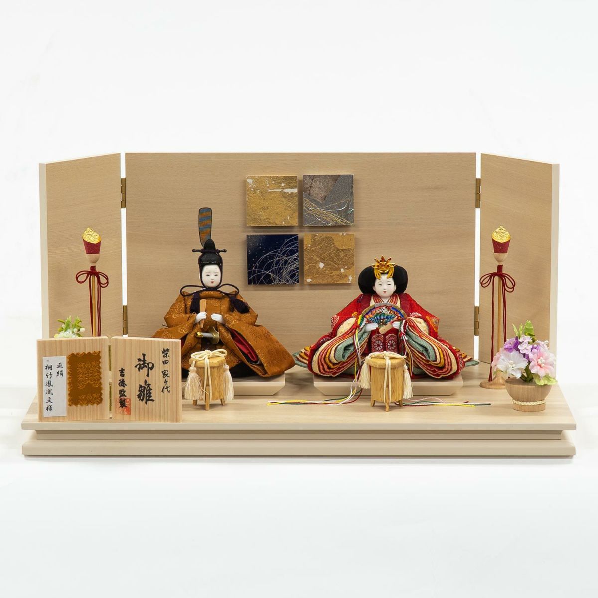 男雛と女雛の一対を飾る、屏風やお道具にもこだわりを持った一式の雛人形です。