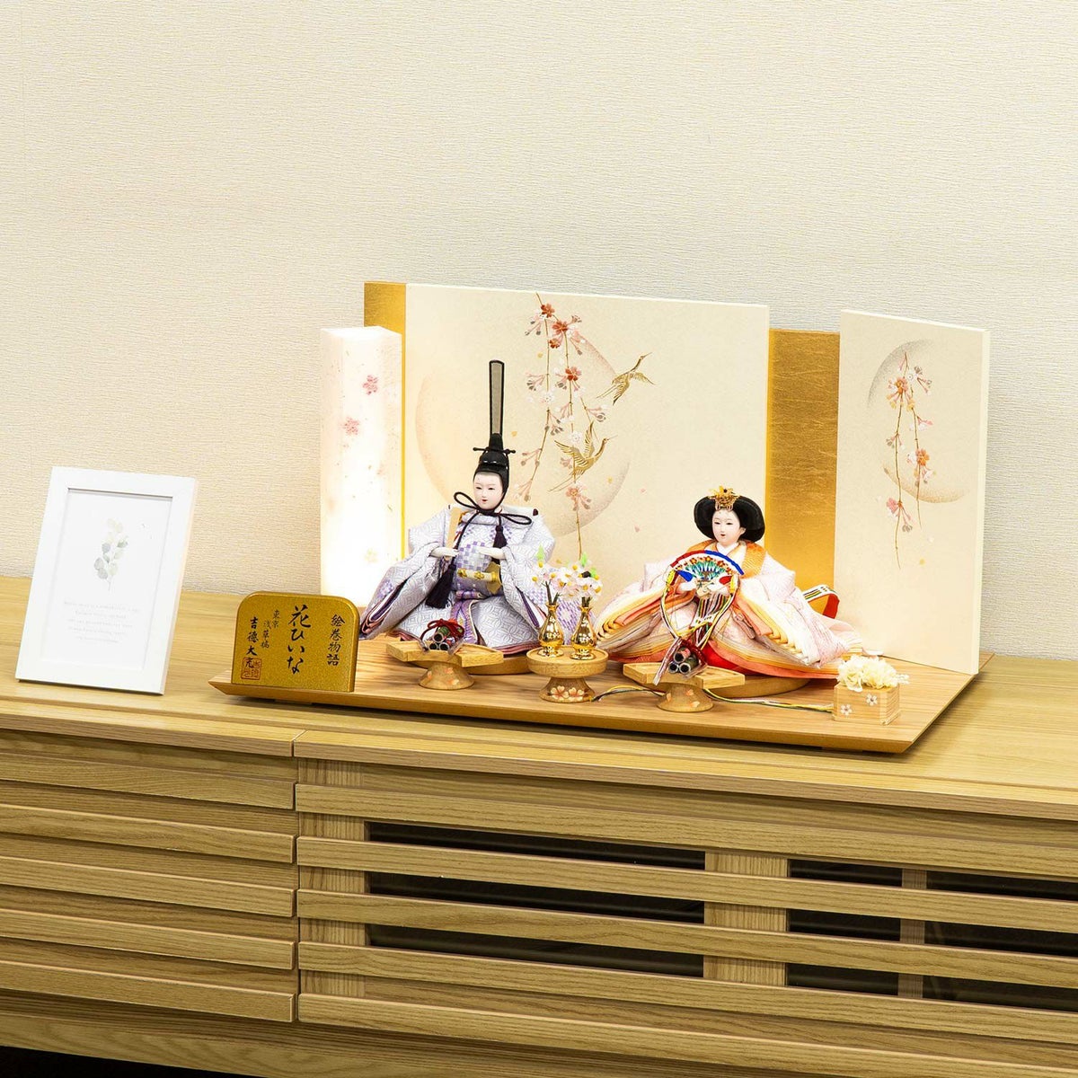 男雛と女雛の一対を飾る、屏風やお道具にもこだわりを持った一式の雛人形です。
