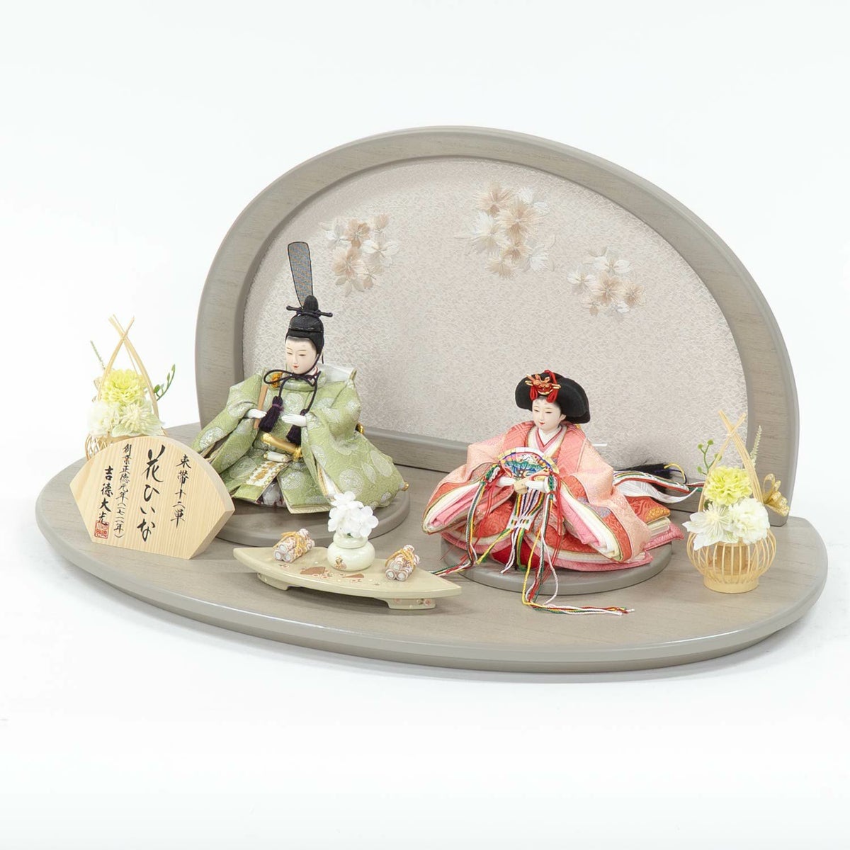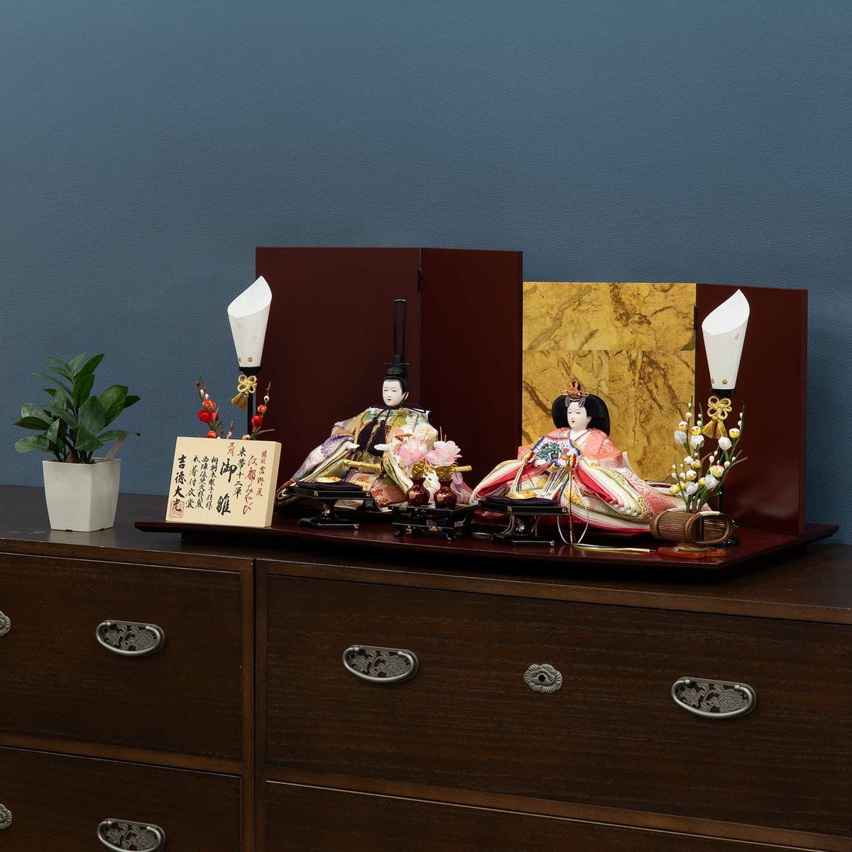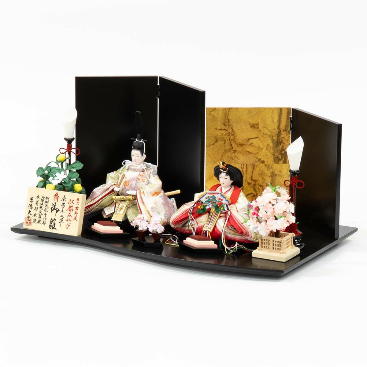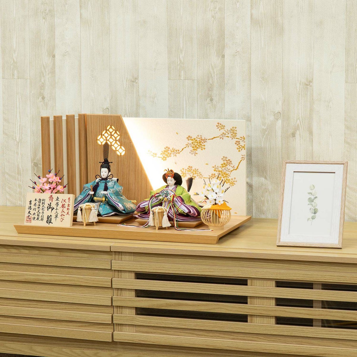 男雛と女雛の一対を飾る、屏風やお道具にもこだわりを持った一式の雛人形です。