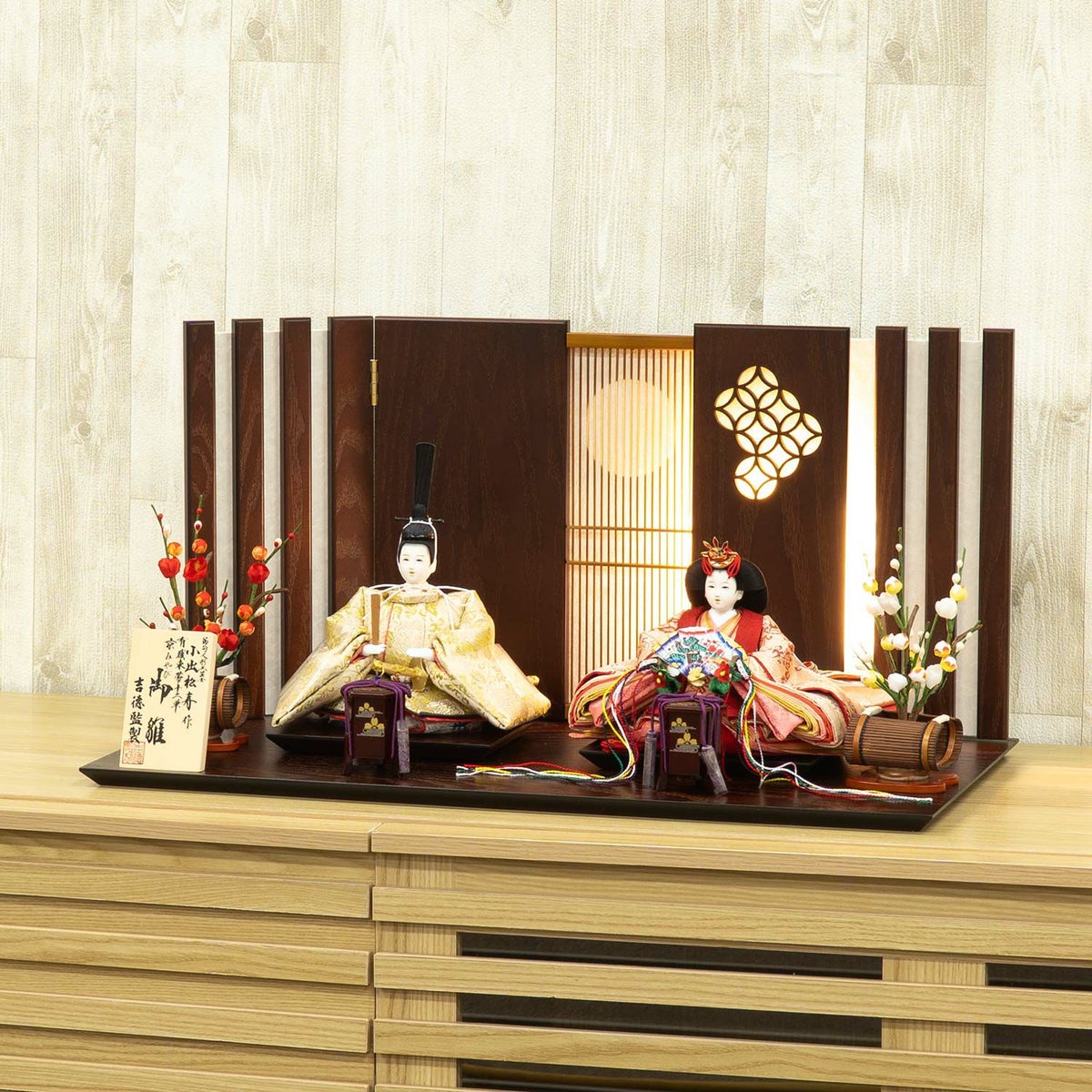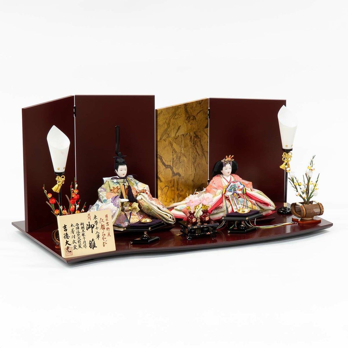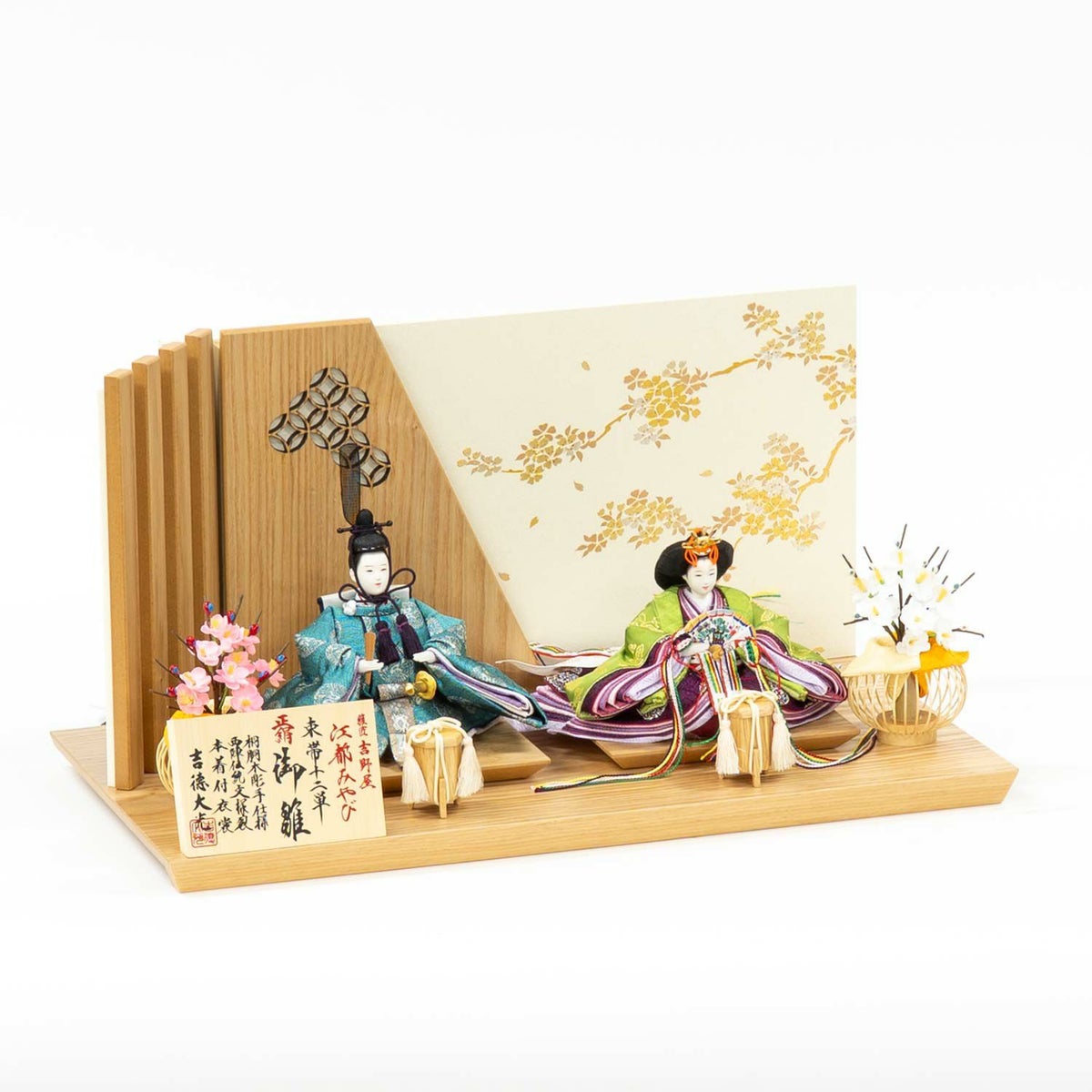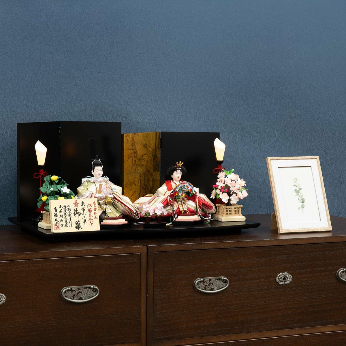 男雛と女雛の一対を飾る、屏風やお道具にもこだわりを持った一式の雛人形です。