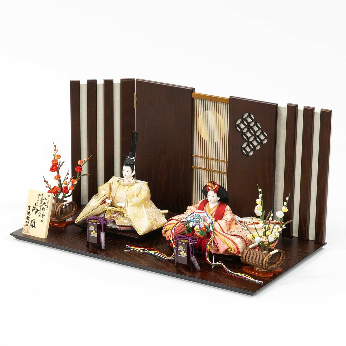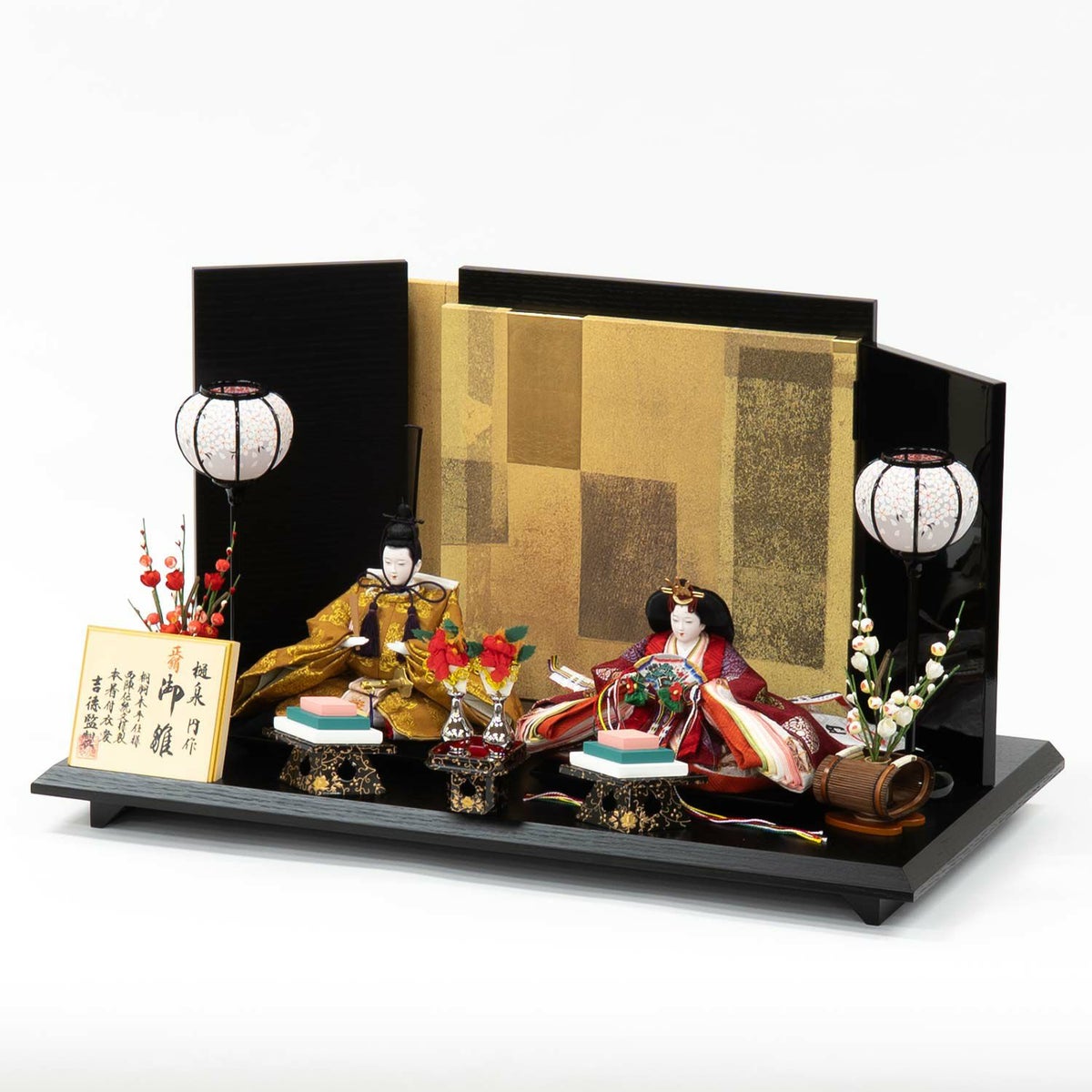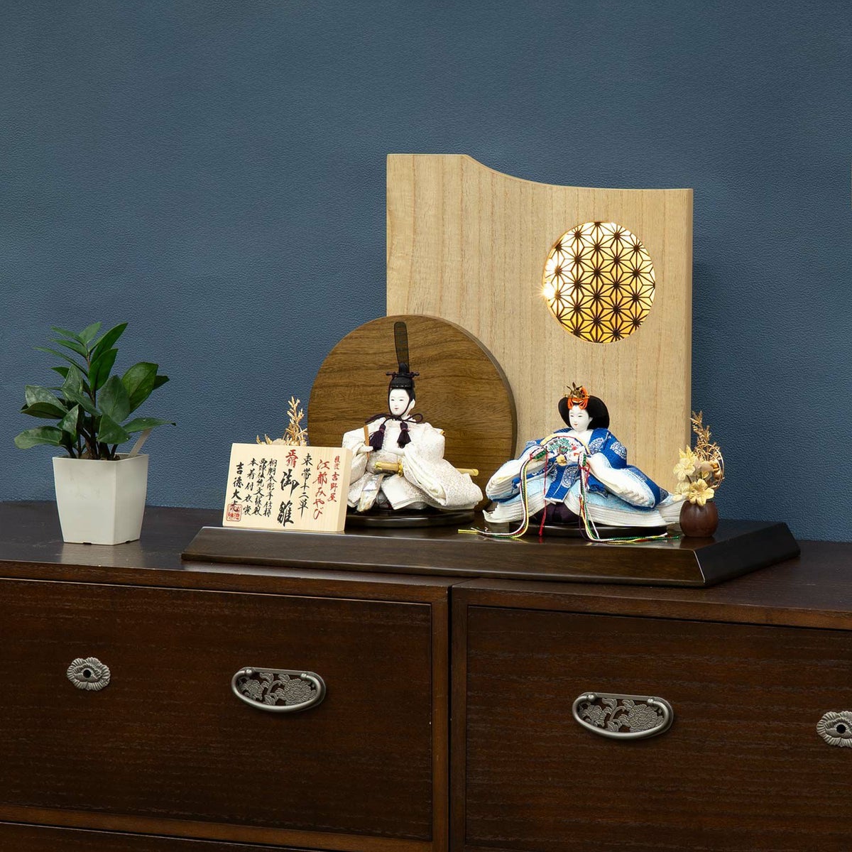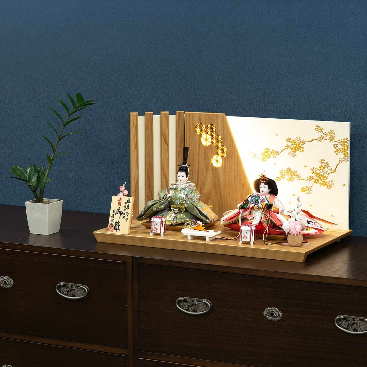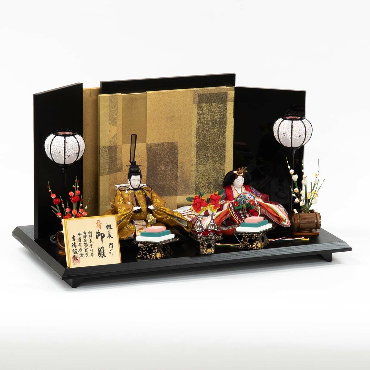 男雛と女雛の一対を飾る、屏風やお道具にもこだわりを持った一式の雛人形です。