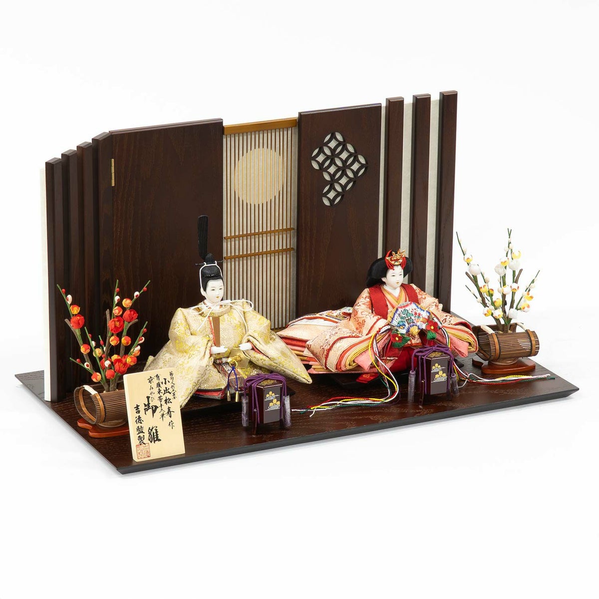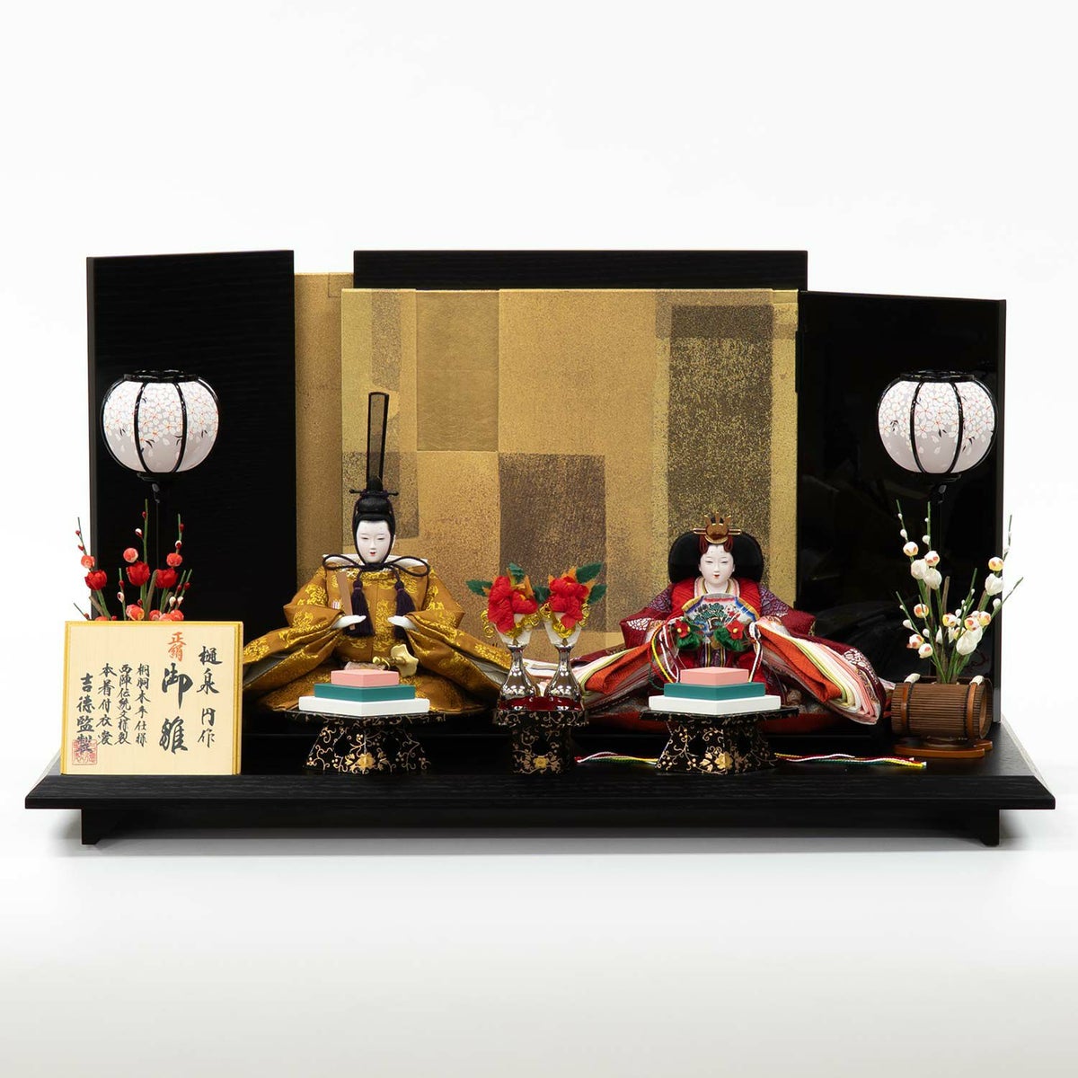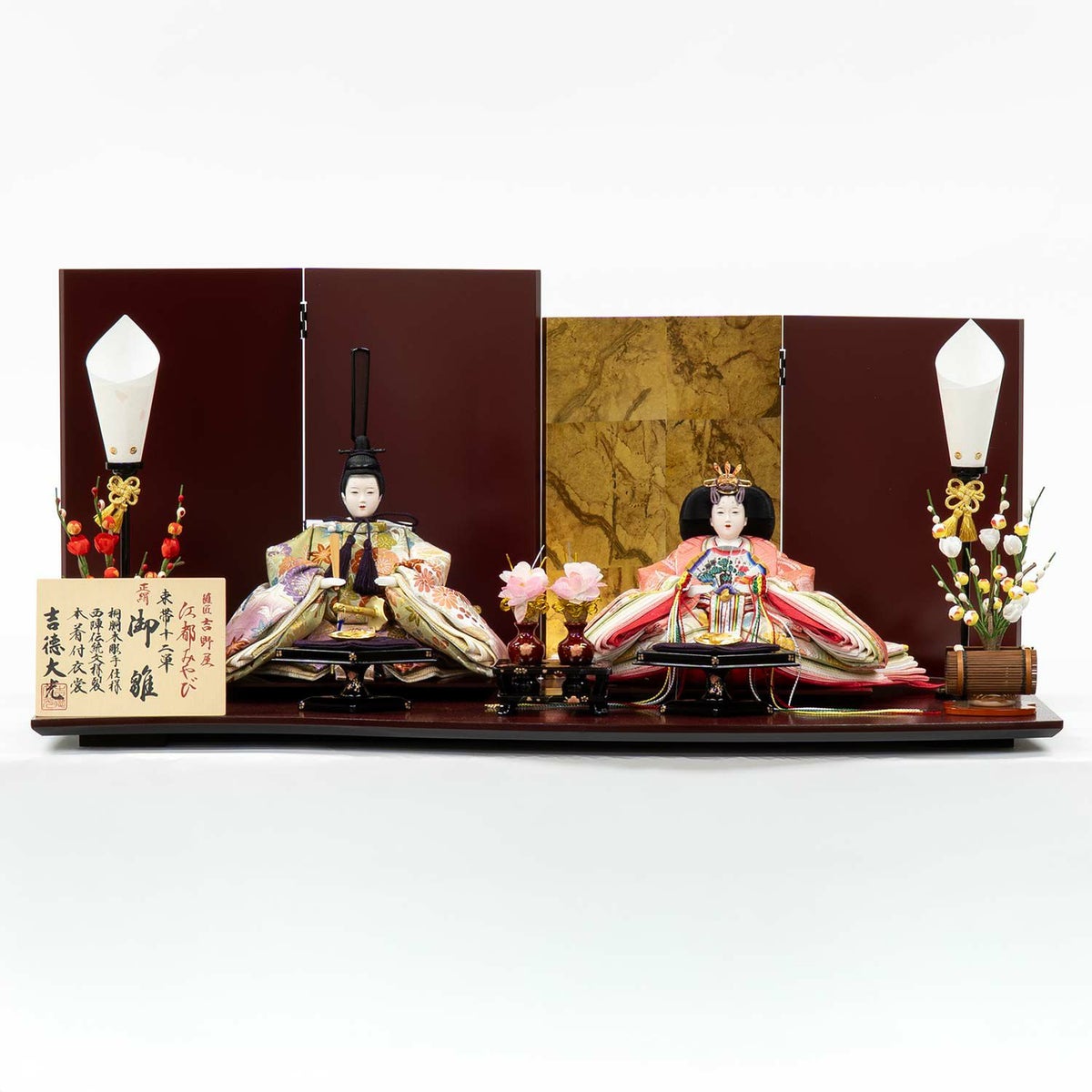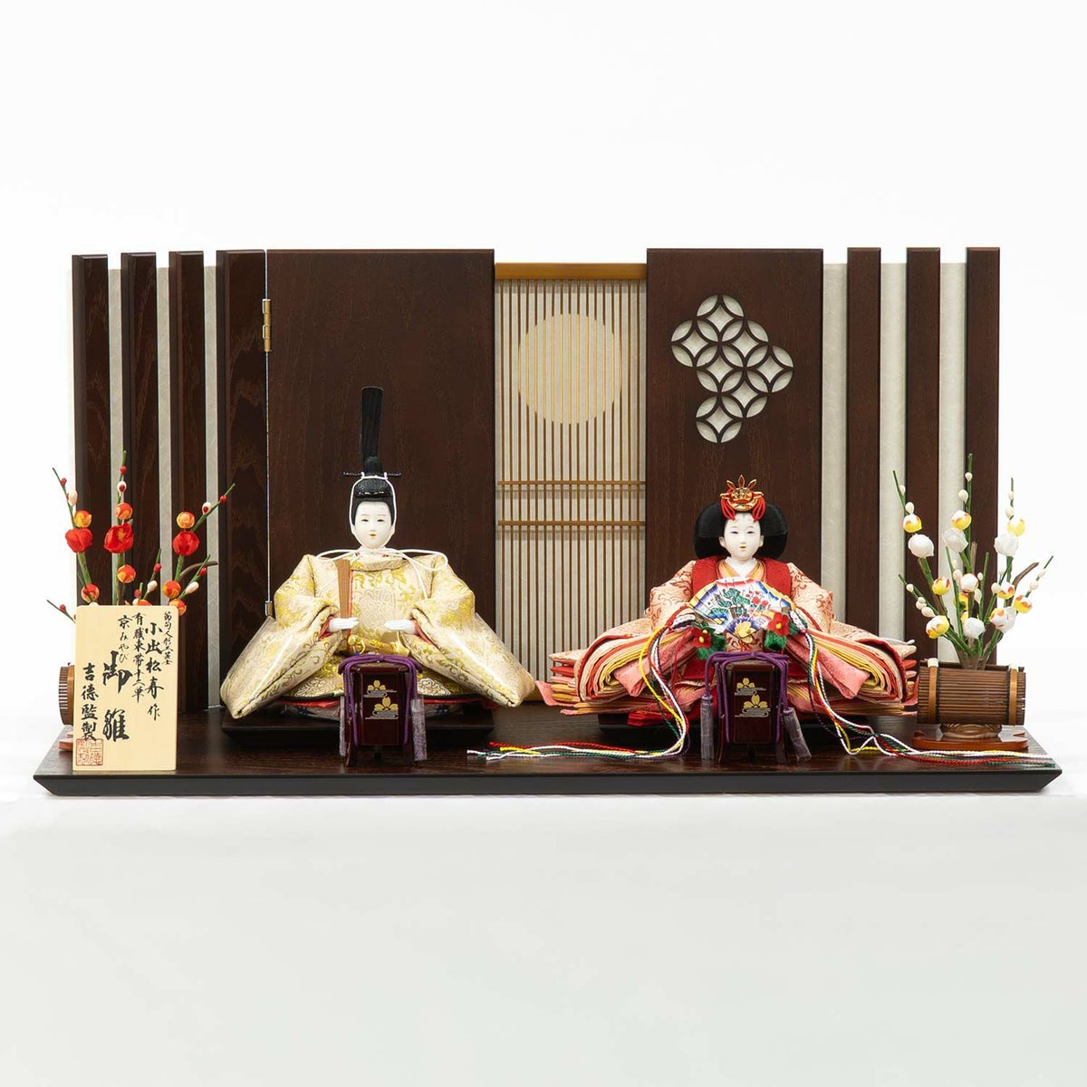 男雛と女雛の一対を飾る、屏風やお道具にもこだわりを持った一式の雛人形です。
