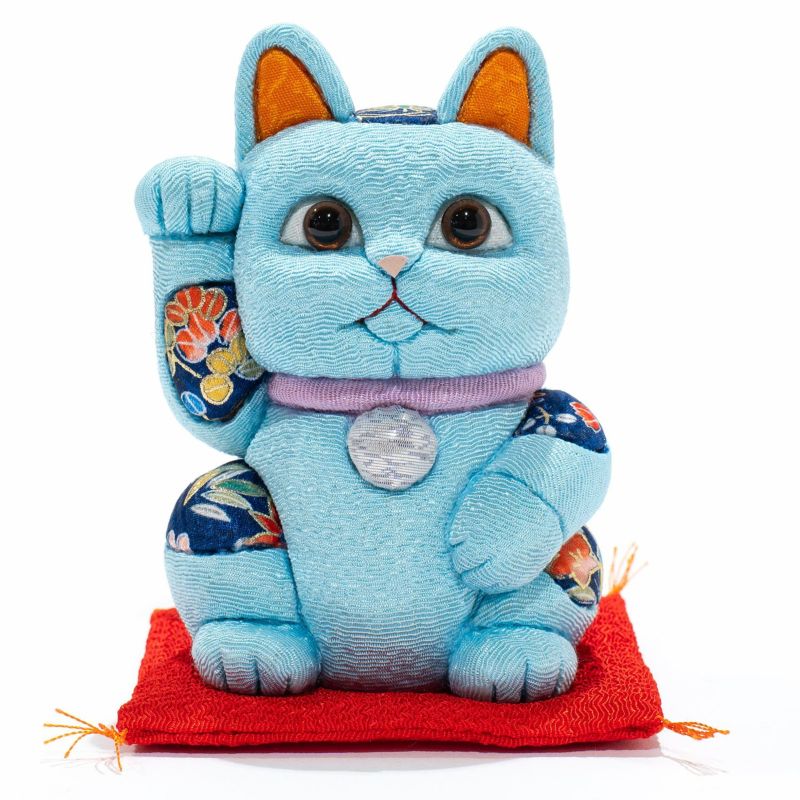 木目込みタイプの招き猫です。招き猫は幸運やお金を招くとされる日本の縁起物で片手を挙げている猫の置物です。