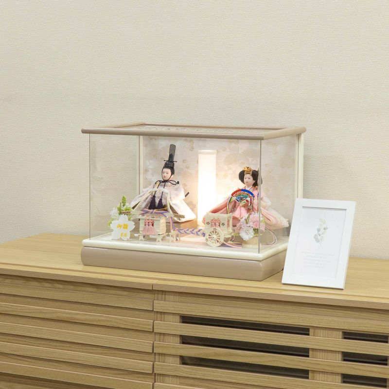 ケース飾りとは、ガラスやアクリルのケースの中に人形や道具が収まっている雛人形です。