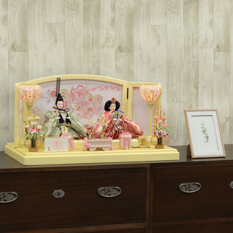 全体をクリーム色でまとめた、暖かみを感じさせる可愛らしい親王飾りです。