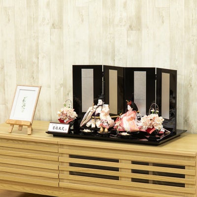 女雛の裾を長く仕立てた特徴的なセットです 前飾りのお道具が可愛いと好評です