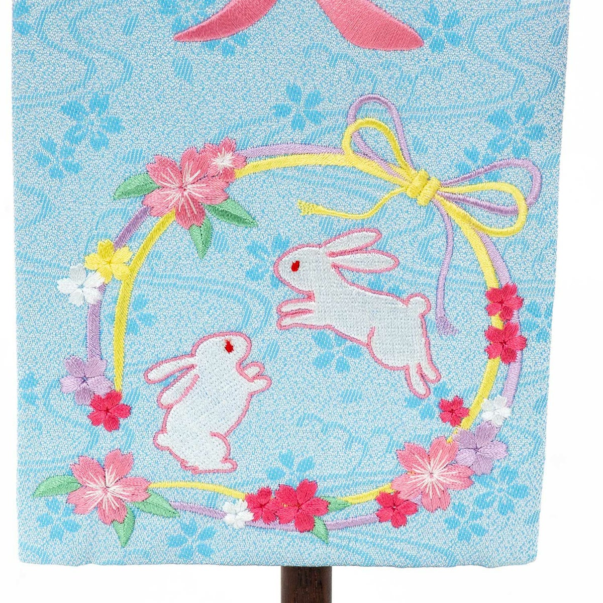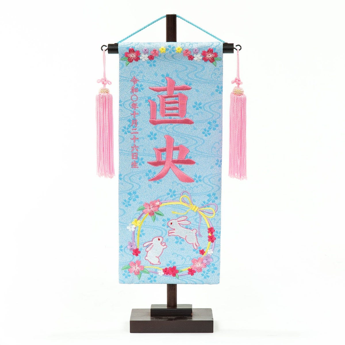 【雛人形】名前旗 ピンク刺繍 兎リース 水色 (小)